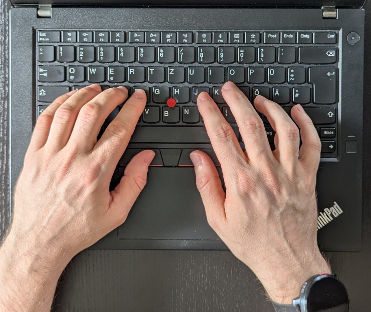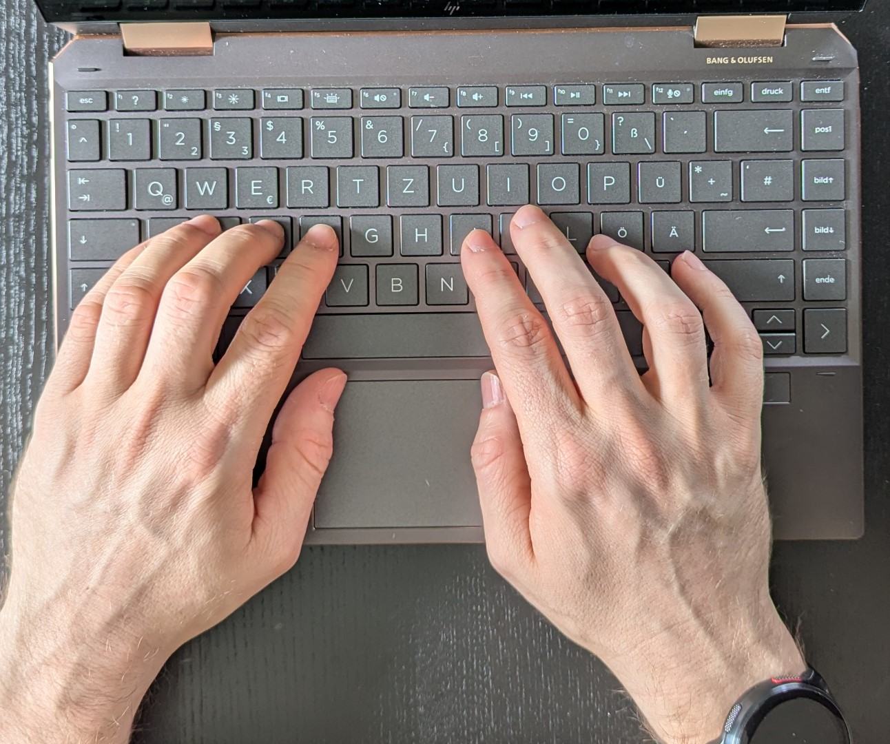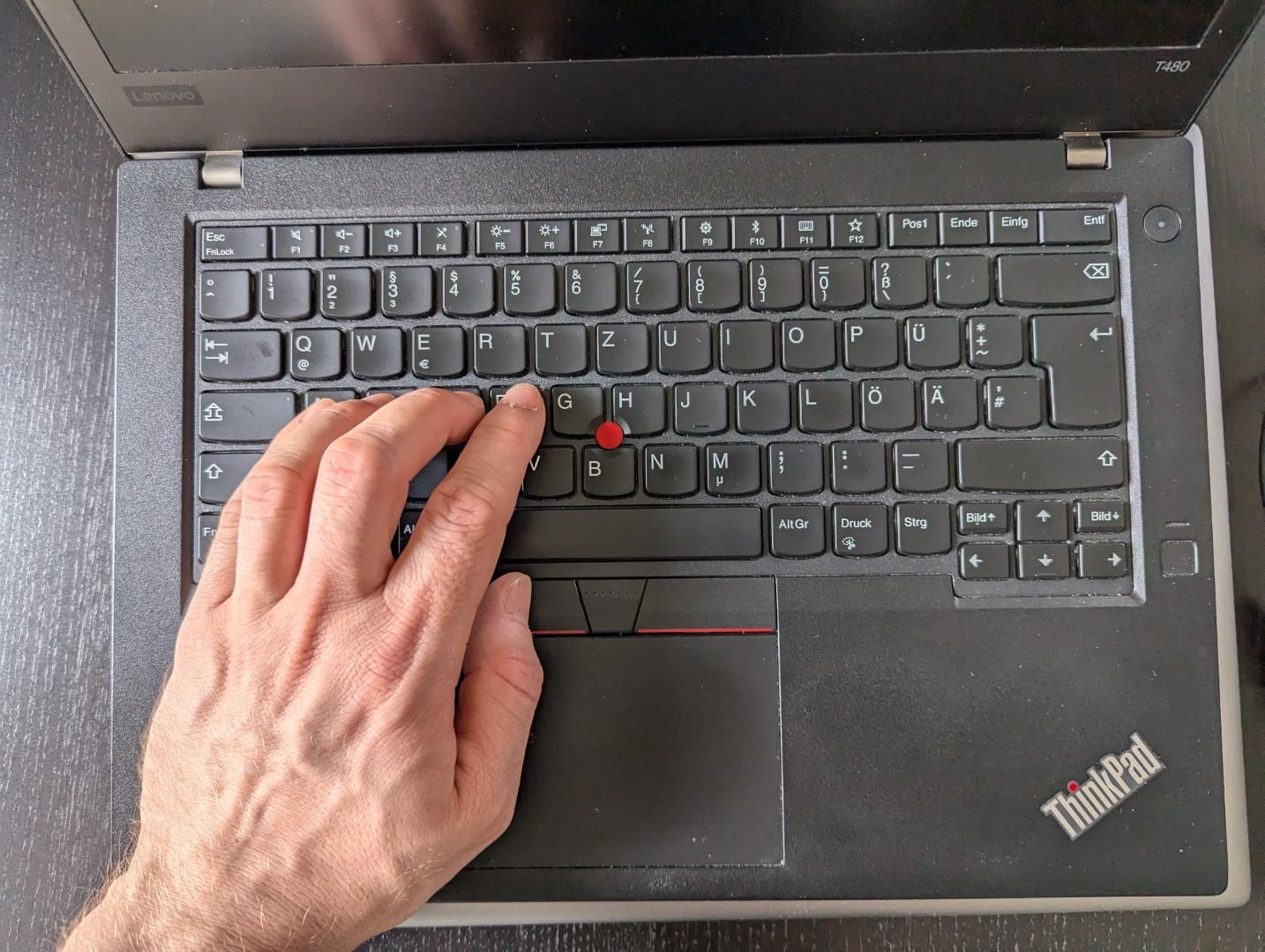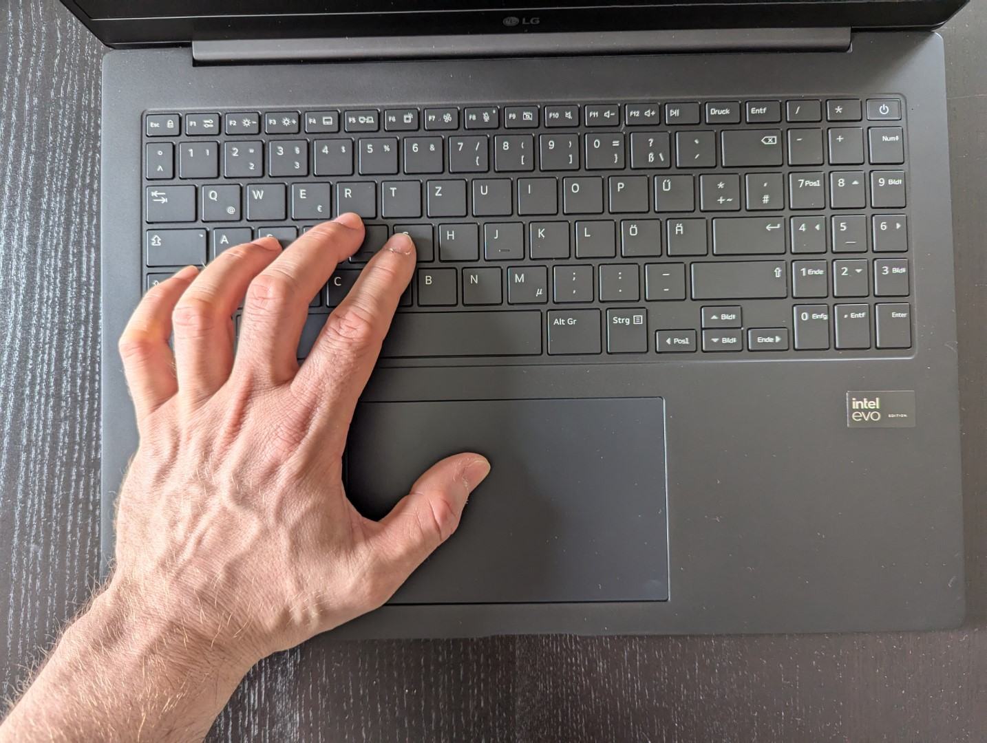 Wofür ist dies wichtig? Ergonomie. Im folgenden zeige ich Fotos aus der folgenden Situation: Man schreibt einen Text und möchte nun beispielsweise einen Button klicken. Ergo nimmt man seinen Daumen und möchte einen Klick auslösen. Hierfür hebt man selten die komplette Hand ab sondern streckt den Daumen um einen Klick auszuführen. Beim LG gram 16 pro muss ich leider meinen Daumen überdurchschnittlich weit strecken, was eine sehr unangenehme und verkrampfte Haltung hervorruft, welche sogar kurz vor schmerzhaft war. Die Fotos können diesen Umstand hoffentlich darstellen. Von Links nach Rechts: LG gram pro 16, Dell Precision 7680, Lenovo ThinkPad T480 und HP Spectre x360. Beim LG-Gerät muss der Daumen deutlich abgespreizt werden, was die Sehnen belastet. Alle anderen Geräte können dies für meinen Geschmack deutlich besser. Lenovo ist hier aufgrund der extrem ergonomischen Tasten ungeschlagen.