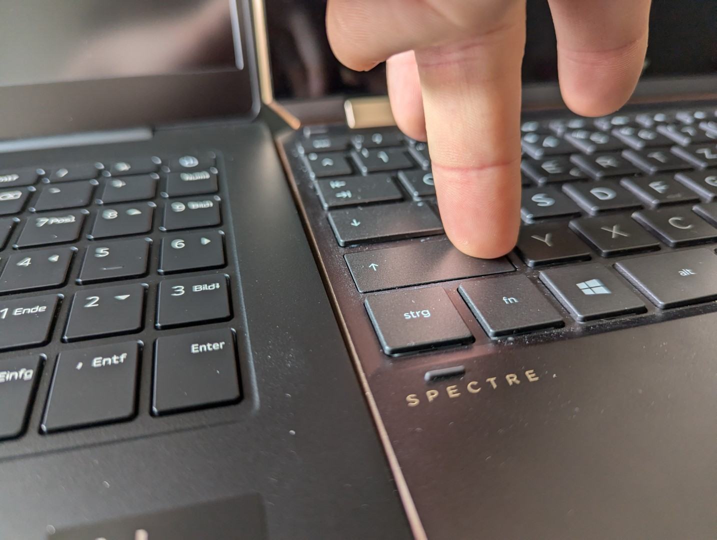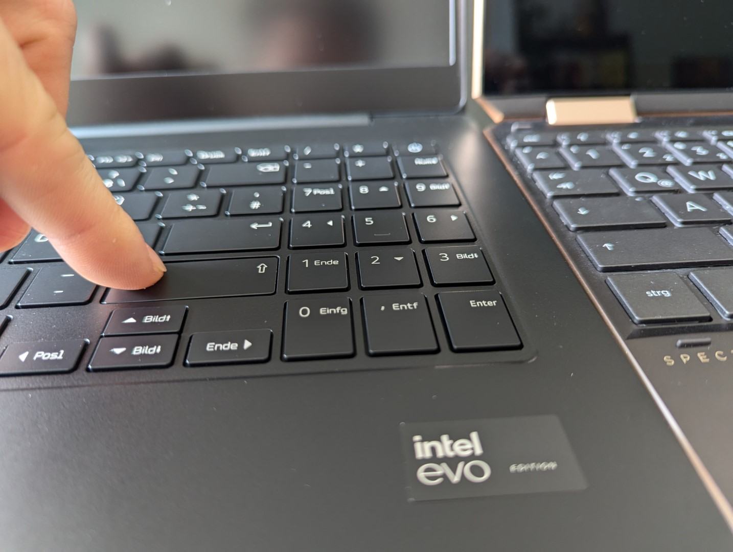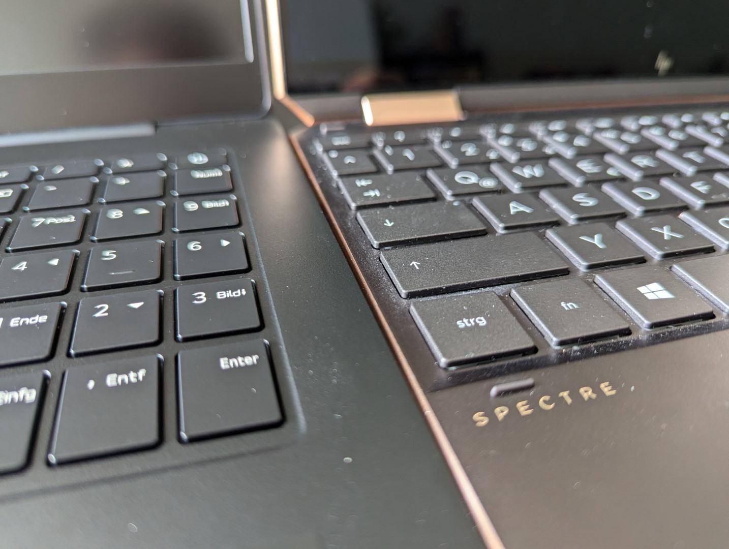 Daher freut es mich, dass das LG gram 16 pro eine durchaus gute Tastatur hat. Die Tasten haben einen satten und kräftigen Druckpunkt. Dies ist mir als kennender Lenovo-Tastatur-Fanboy sehr wichtig. Auf der anderen Seite hat das LG gram 16 pro einen extrem kurzen Hub-Weg, was ich persönlich als unangenehm empfinde. Dabei zeigt das HP Spectre x360, dass es trotz gleicher Bauhöhe besser geht. Beachtet man die Bilder, so sieht man, dass beide Laptops identisch hoch sind. Der Hub-Weg beim HP-Gerät ist jedoch deutlich tiefer, da die Tastatur „tiefer eingelassen“ ist. Dies führt meiner Meinung nach zu einem deutlich besserem Tipperlebnis und in meinem Fall auch zu weniger Fehlern.