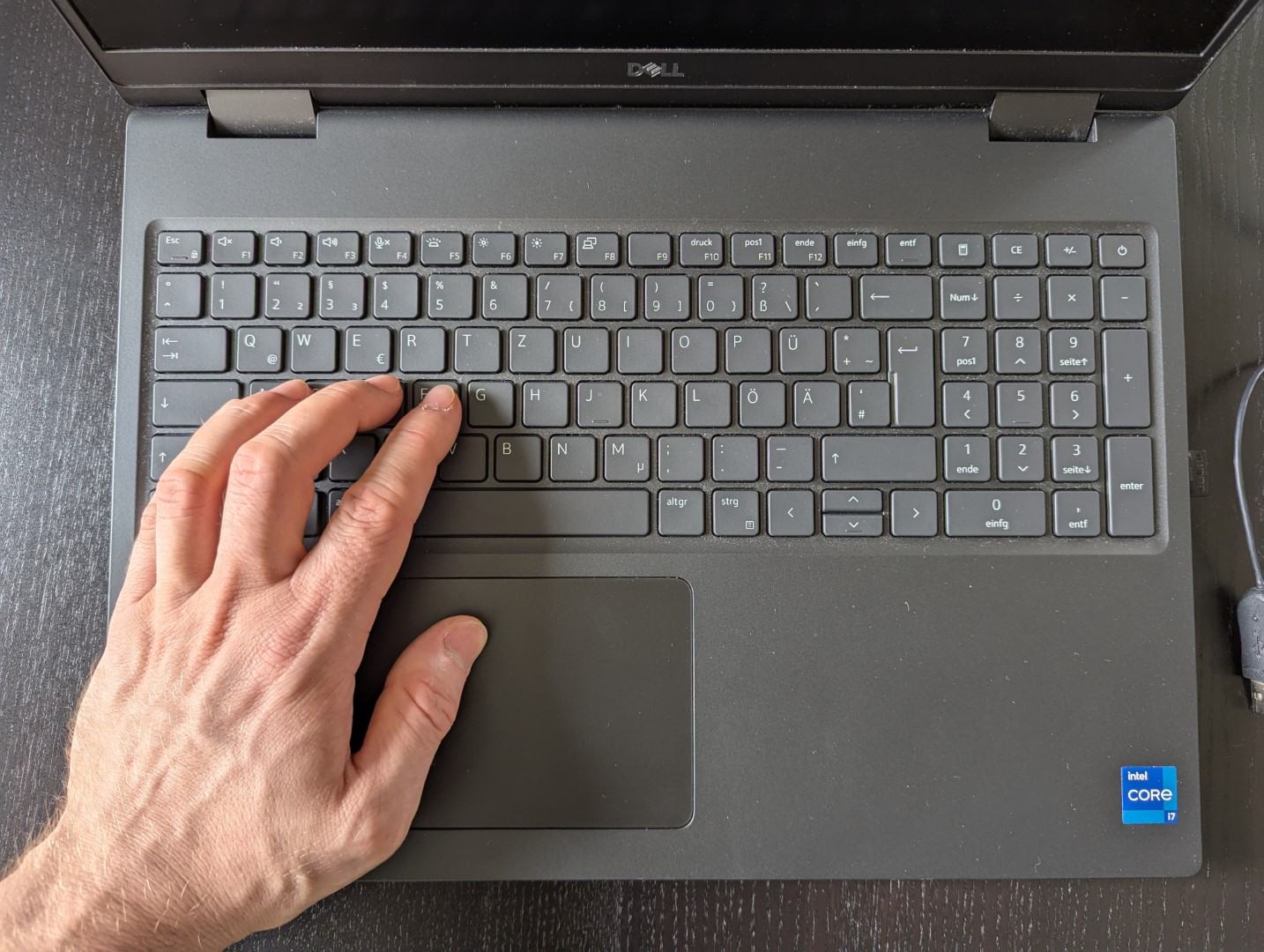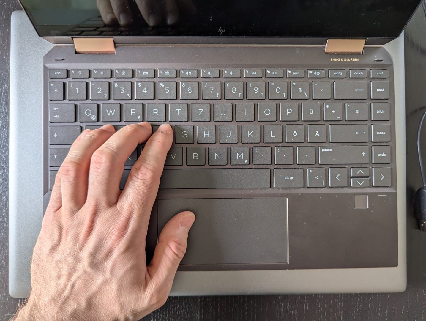 Das Touchpad ist groß und besitzt keine Glasabdeckung. Als Linkshänder bin ich froh, dass die Position relativ mittig zur Tastatur ist (wenn man den Numblock) ignoriert. Dies ermöglicht eine ähnlich gute Bedienung mit der linken sowie der rechten Hand. Bei normaler Handhaltung liegen die Hände und Daumen gut Mittig, anders beim HP-Gerät, wo aufgrund der Geräte-Größe die Daumen kaum das Touchpad erreichen. Königsklasse für mich mein altes Lenovo-Gerät aus dem Studium, wo die Finger perfekt den integrierten Stick erreichen und die Daumen ergonomisch auf den physikalischen „Maustasten“ liegen.
