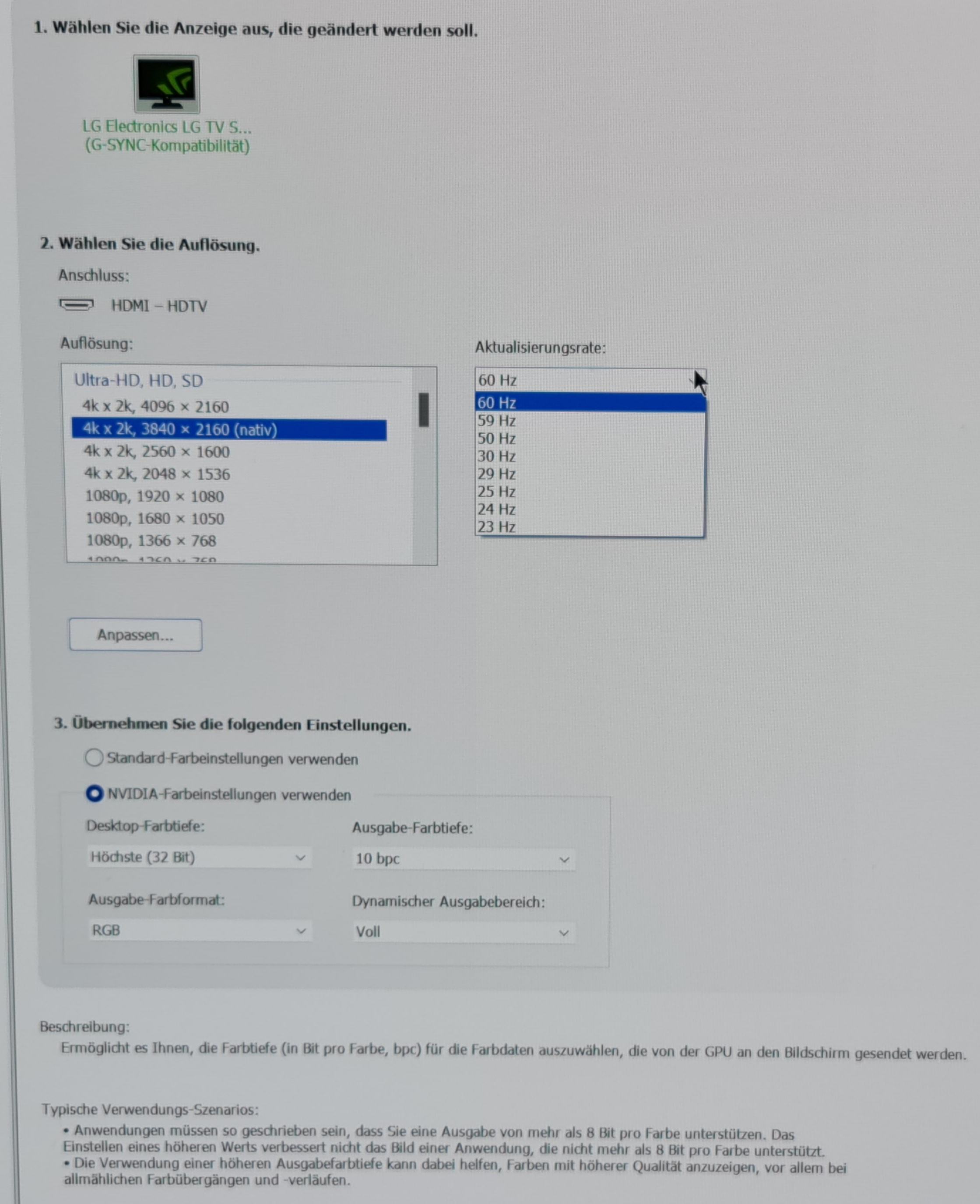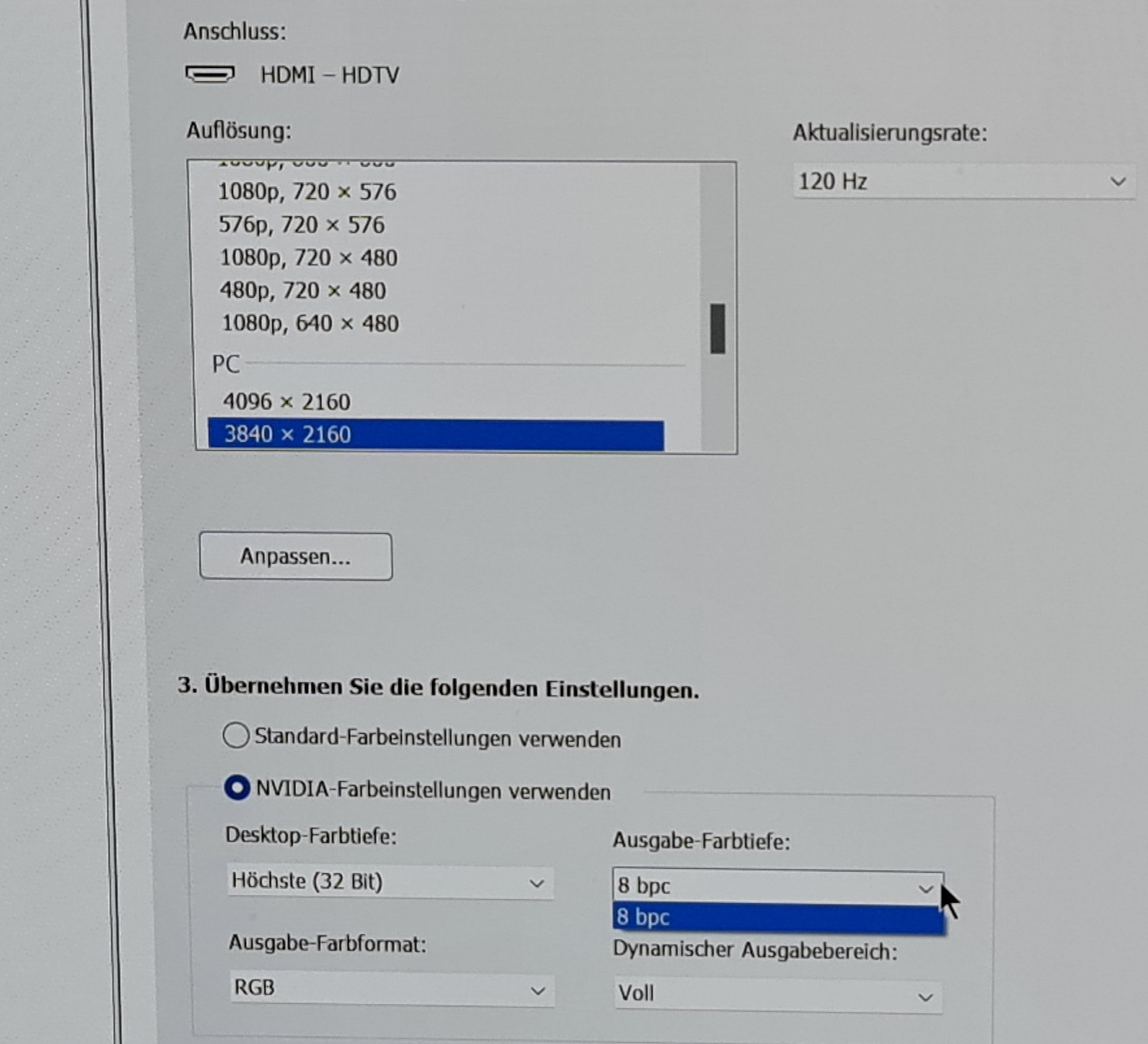 Wenn ich dann aber in der Nvidia Systemsteuerung oben 3840x2160 nativ auswähle, kann ich sowohl 8, 10 als auch 12 Bit einstellen. Allerdings bin ich dann auf 60 Hz beschränkt und kann keine 120 Hz mehr auswählen. Dafür zeigt er im LG Menü aber auch 10 Bit bzw. 12 Bit an.