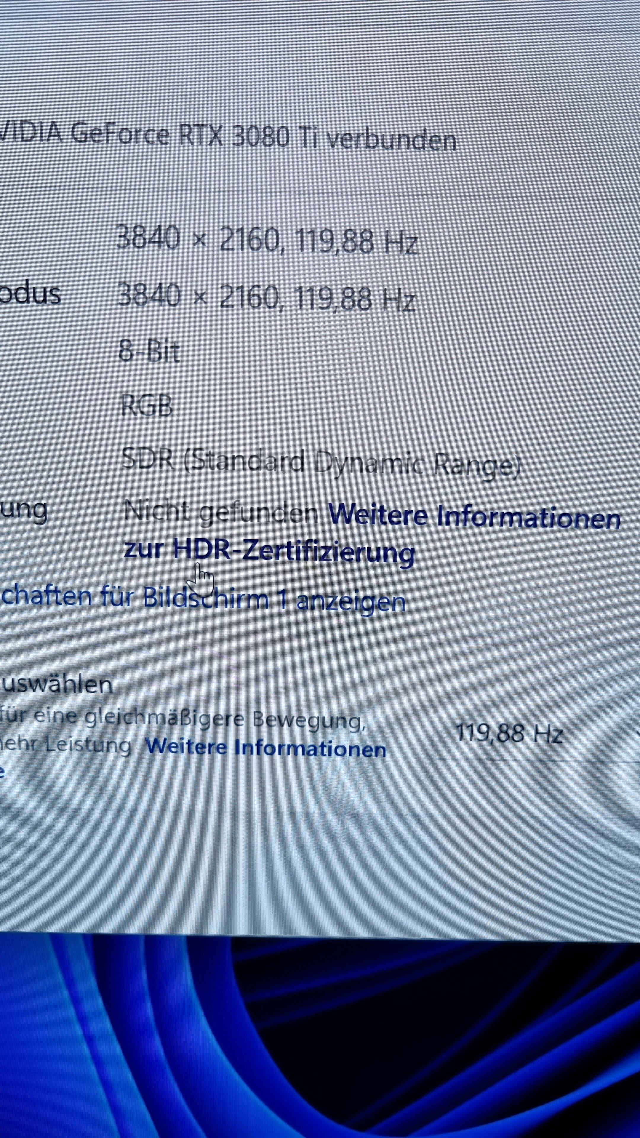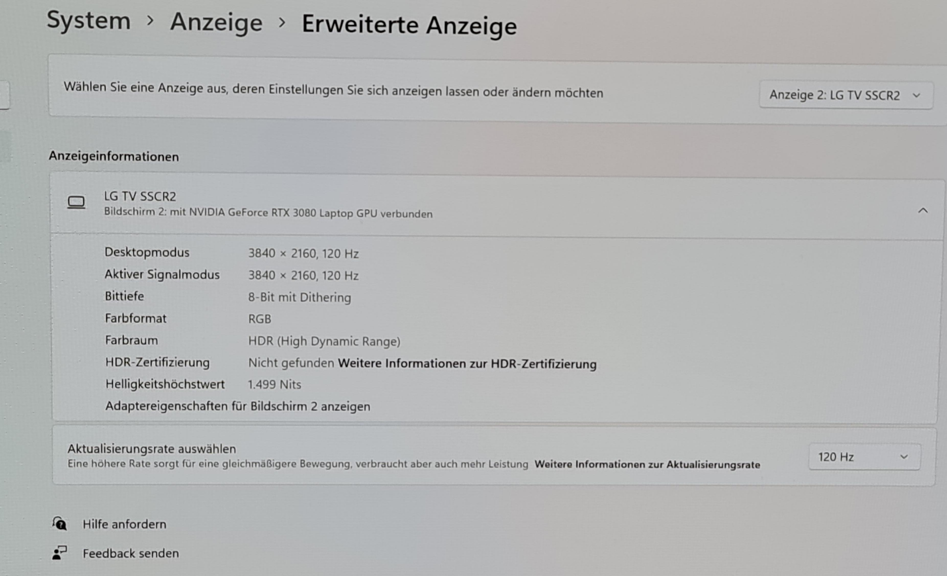 Das Problem jetzt ist aber, dass ich mit der Auflösung 3840x2160 zwar 120 Hz auswählen kann (in der Nvidia Systemsteuerung, unten bei PC) ich dann aber nur 8 Bit auswählen kann und dies im LG VRR Menü auch so angezeigt wird. 10 Bit oder gar 12 Bit lassen sich gar nicht erst anwählen. Und man hört ja überall, dass 8 Bit gar kein wirkliches HDR ist, da mindestens 10 Bit benötigt werden. In der Windows 11 Ansichtseinstellung wird dann auch ausschließlich 8-Bit mit Dithering angezeigt.