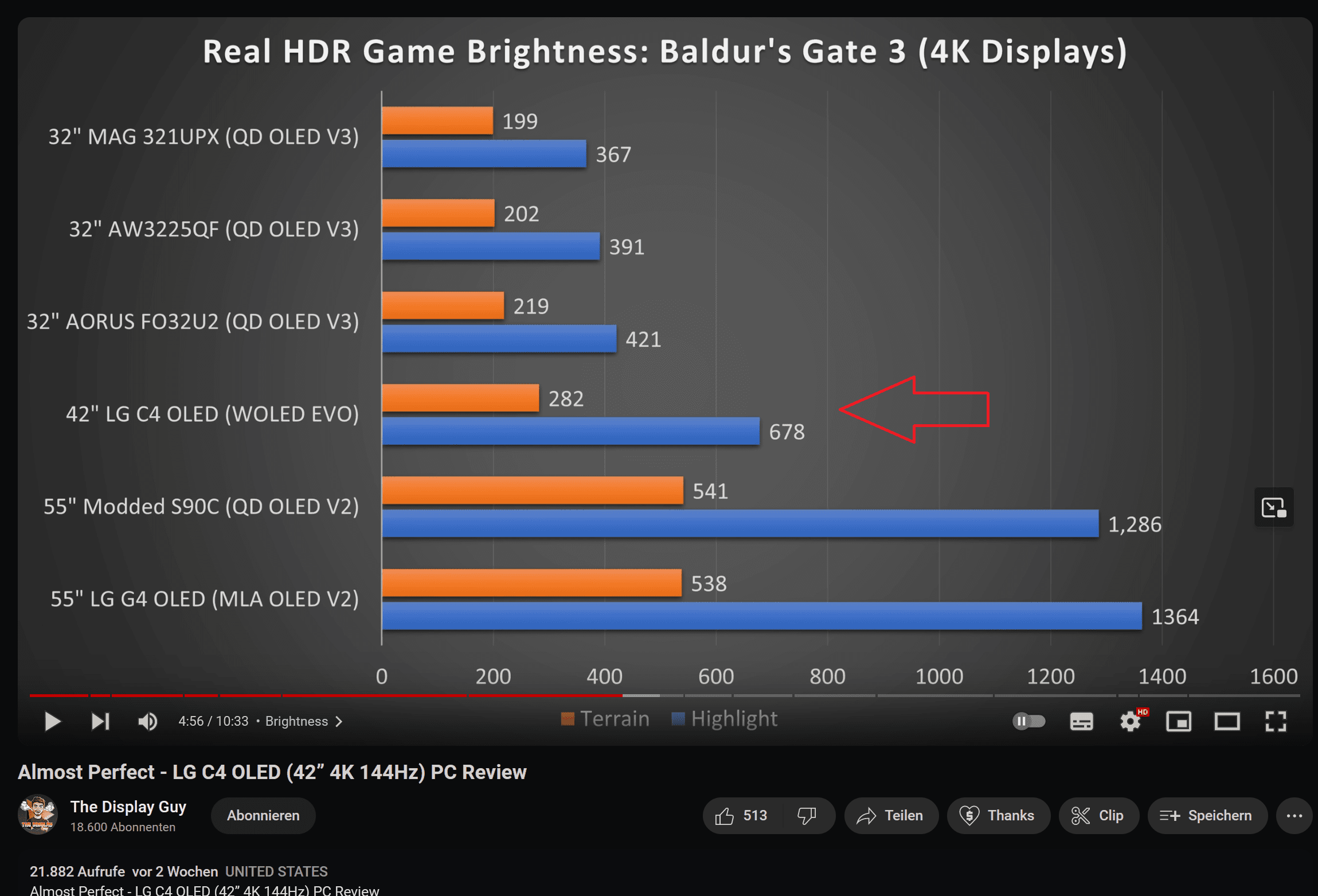 Mein 2020er LG 48" CX kommt schon auf knappe 800 Nits da hat sich also weiterhin im grunde wohl nix getahn selbst 4 Jahre später während halt die G Serie weiter und weiter davon zieht