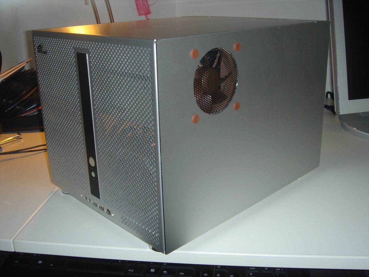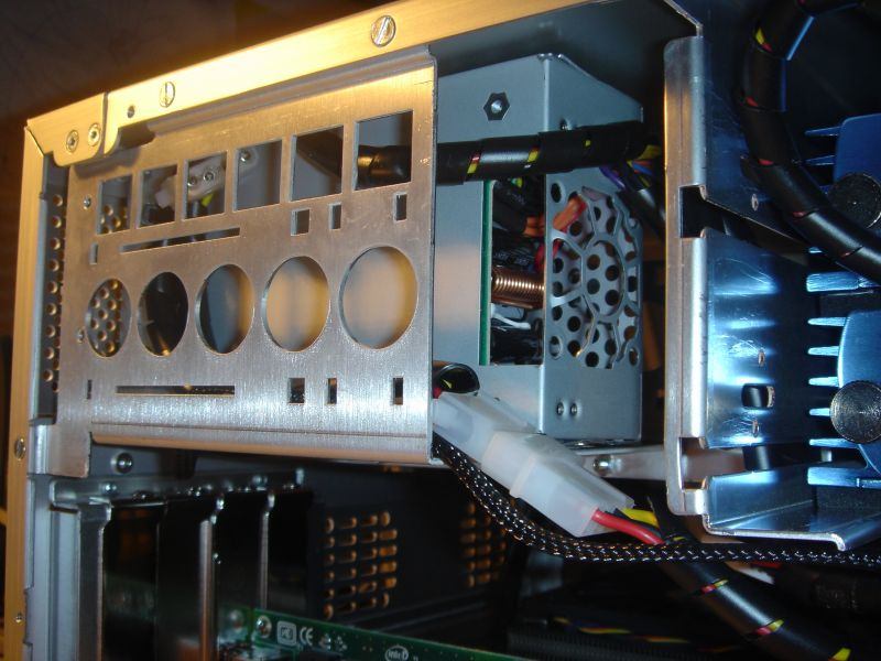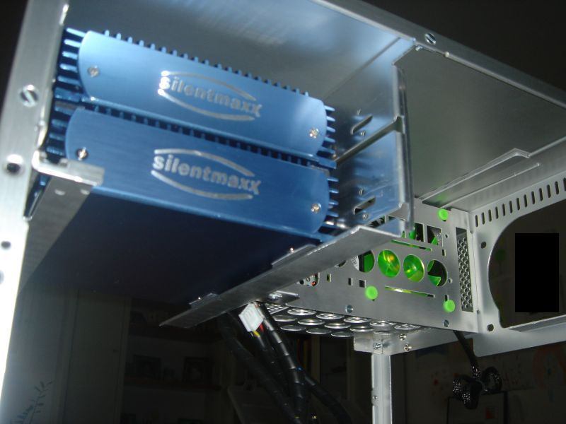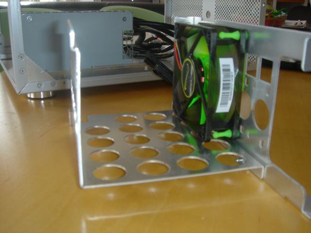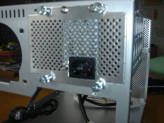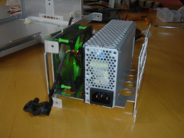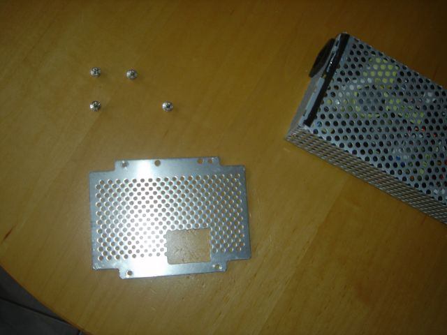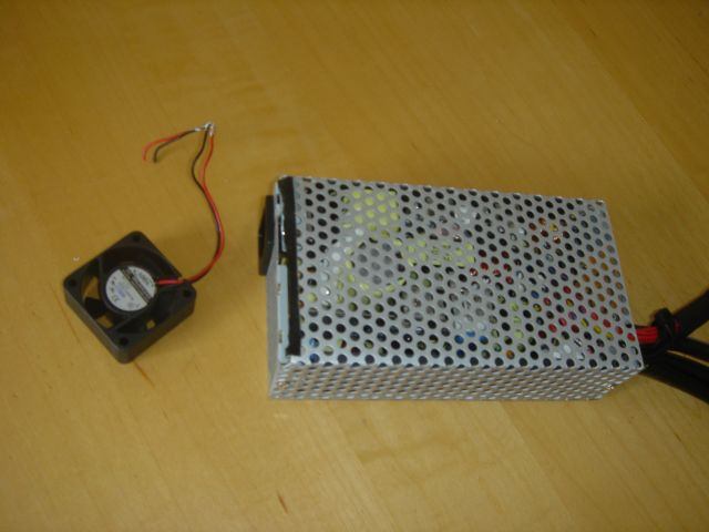 Nachdem dieses kleine 180W-Netzteil (180W Micro ATX Netzteil FSP18050PLA) offensichtlich mit Kreissägen-Venti geliefert wurde, musste ich mir was überlegen, da ich den Platz wo normalerweise das NT hinkommt noch brauche. Also kurzerhand NT geöffnet, 40mm Kreissäge ausgebaut, und neuen Deckel geschnitten und gebogen (Alu-Lochblech), da ich neben das NT einen Lüfter positionieren muss. Das Ganze dann im HDD-Käfig eingebaut, und in der Abdeckung die passenden Öffnungen gemacht. Sorry für die teilweise unscharfen Bilder! Das erste Bild ist das Original-NT, allerdings war bei meinem der kleine Lüfter an der anderen Stirnseite plaziert.