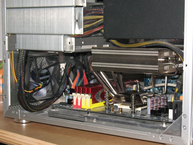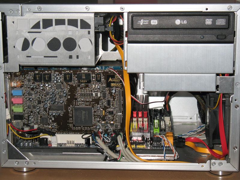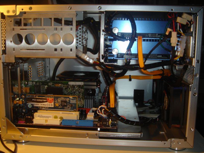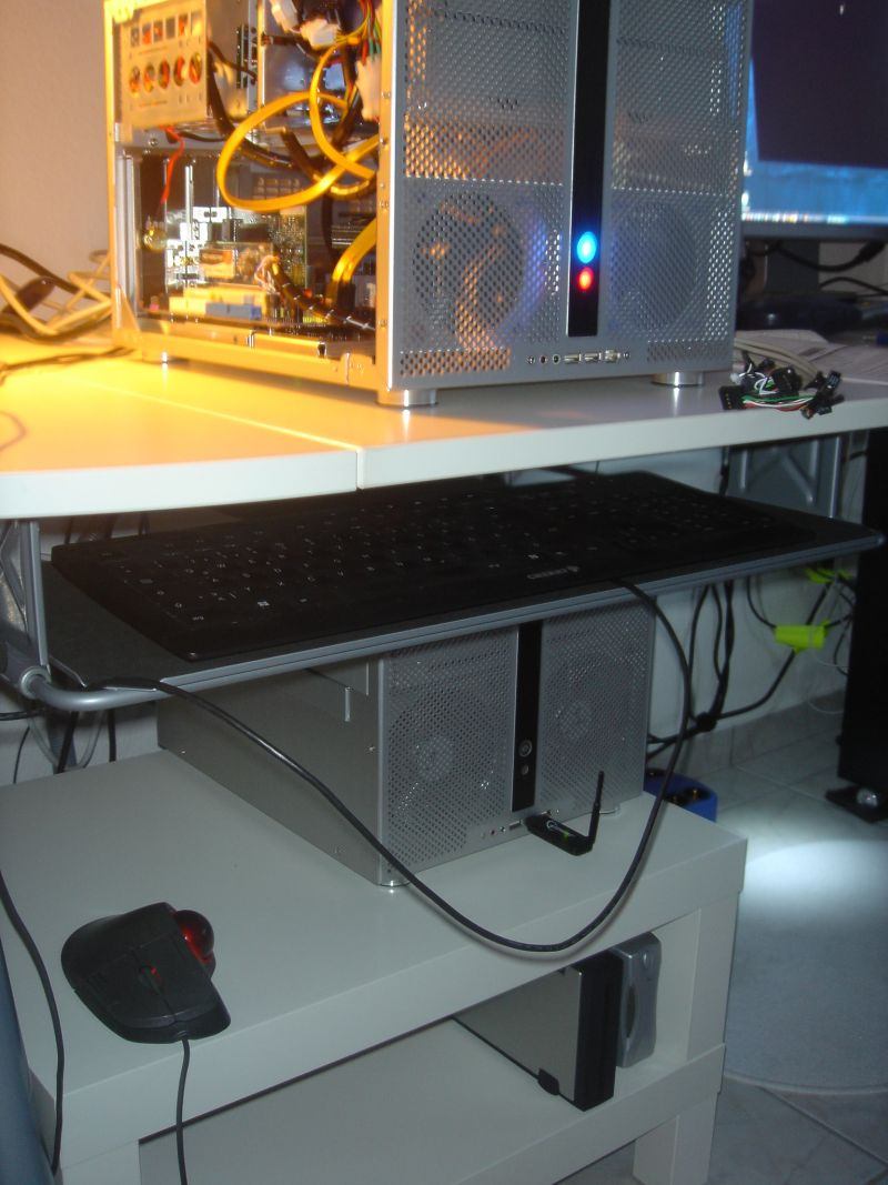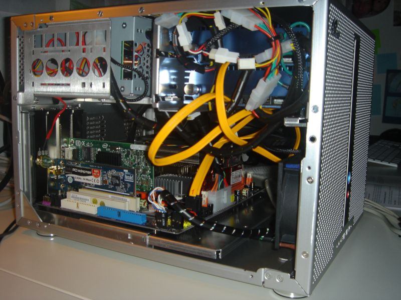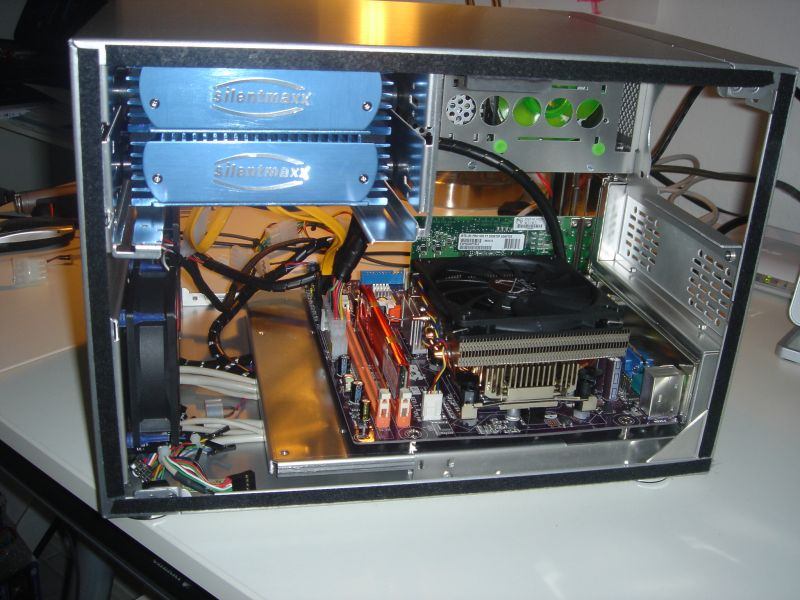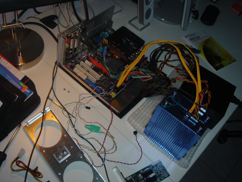 Nachdem dieses kleine 180W-Netzteil (180W Micro ATX Netzteil FSP18050PLA) offensichtlich mit Kreissägen-Venti geliefert wurde, musste ich mir was überlegen, da ich den Platz wo normalerweise das NT hinkommt noch brauche. Also kurzerhand NT geöffnet, 40mm Kreissäge ausgebaut, und neuen Deckel geschnitten und gebogen (Alu-Lochblech), da ich neben das NT einen Lüfter positionieren muss. Das Ganze dann im HDD-Käfig eingebaut, und in der Abdeckung die passenden Öffnungen gemacht. Sorry für die teilweise unscharfen Bilder! Das erste Bild ist das Original-NT, allerdings war bei meinem der kleine Lüfter an der anderen Stirnseite plaziert.