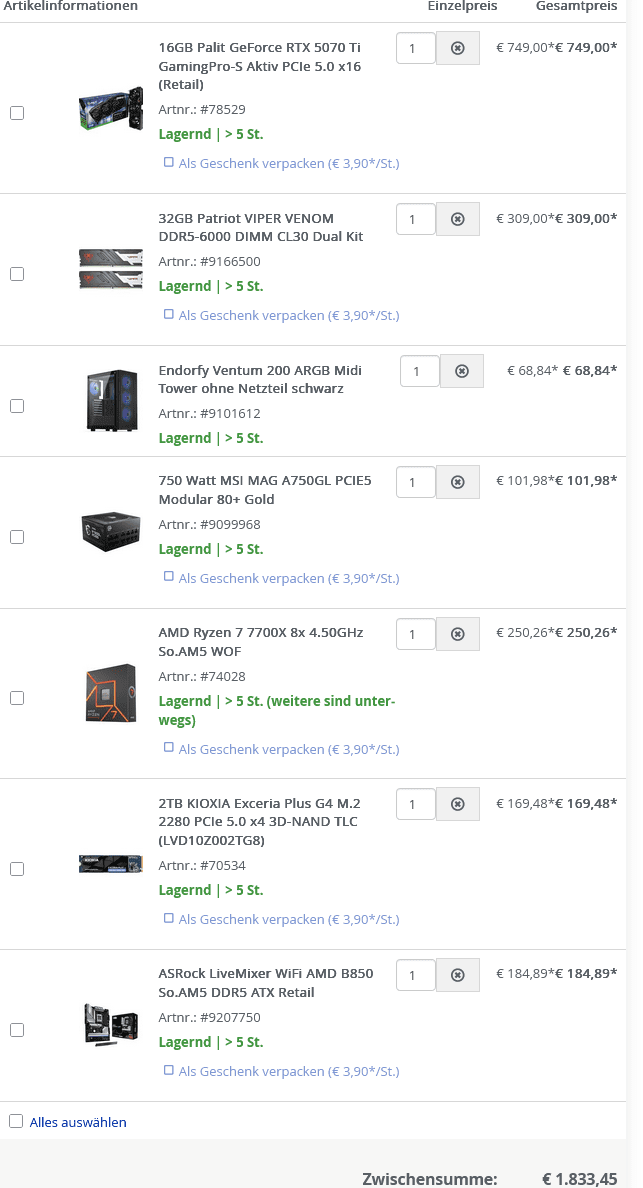 Wenn du einen effizienten, kühlen und leisen PC willst, reicht der Ryzen 7 7700 völlig aus. Der 7700X lohnt sich nur, wenn du wirklich das letzte Quäntchen Leistung brauchst – ansonsten ist der Unterschied kaum spürbar. Besser das Geld in die Karte stecken.Du hast Recht.