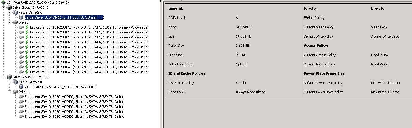 Im Betrieb bekomme ich das allerdings ums verrecken nicht für Configured Good's hin. Nagut denk ich mir probierst du ein wenig mit Firmwares rum, siehe da, eine "23.1.1-0004_SAS_FW_Image_3.140.15-1320" gibt mir immerhin die Menueinträge im MSM für Configured Drives. Jedoch bleibt unabhänging von dem was ich konfiguriere die Option "Current Power Save Policy" auf "None" und somit auch die Platten an :(
