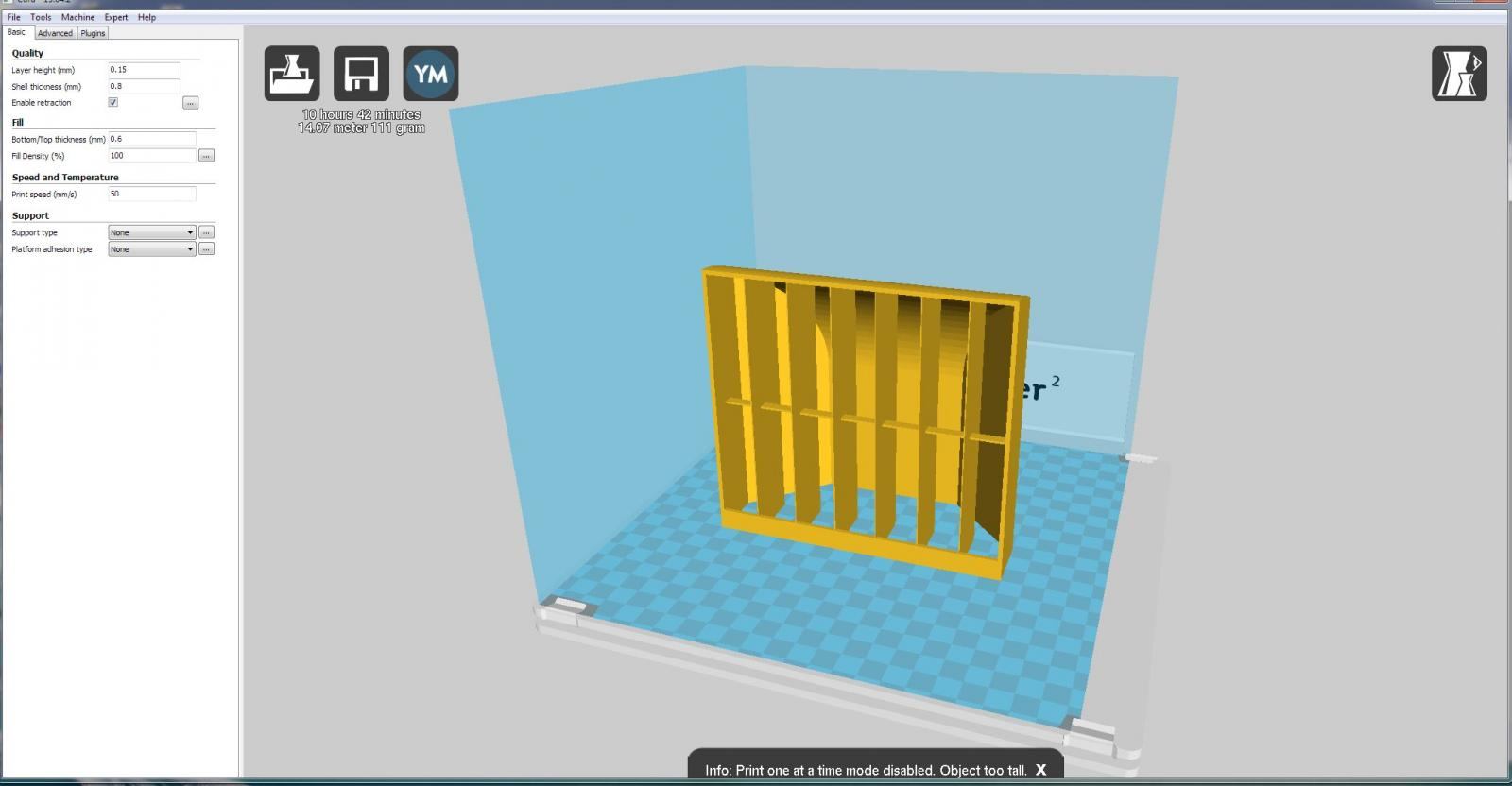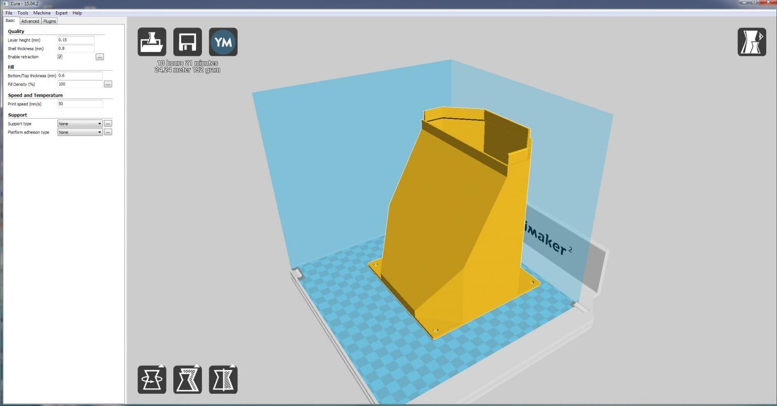 Gedruckt wurde mit der Standard 0,4mm Düse und einer Schichtdicke von 0,15mm, sonst hätte das ganze noch länger gedauert, Fill density aber 100%.