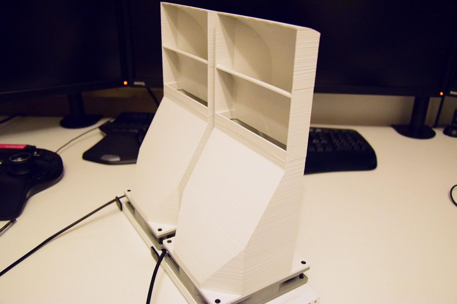 Bei dem oberen Teil habe ich Stützstreben gleich mit einkonstruiert, da der Drucker oben bei der Rundung sonst "in der Luft" drucken würde. Die werden nachher dann einfach rausgebrochen, da sehr dünn.