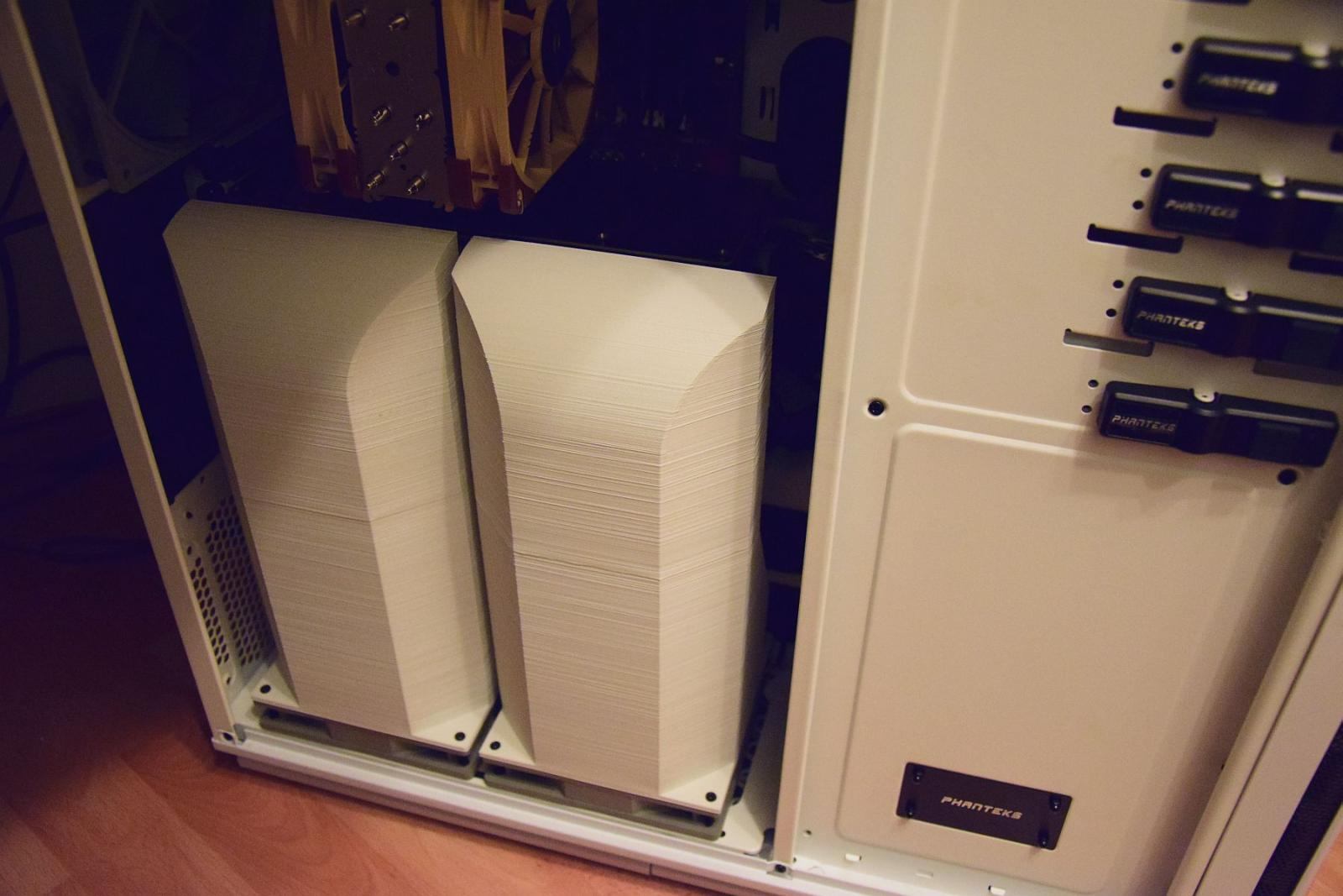 Das Phanteks bietet ja enorm viel Platz und WaKü ist erstmal kein Thema. Nach etwas Ausmessen kam dann die Idee dabei raus, dass Lüfterkanäle die Luft der 2 unten verbauten 14cm Noctuas direkt auf die beiden Grakas leiten.