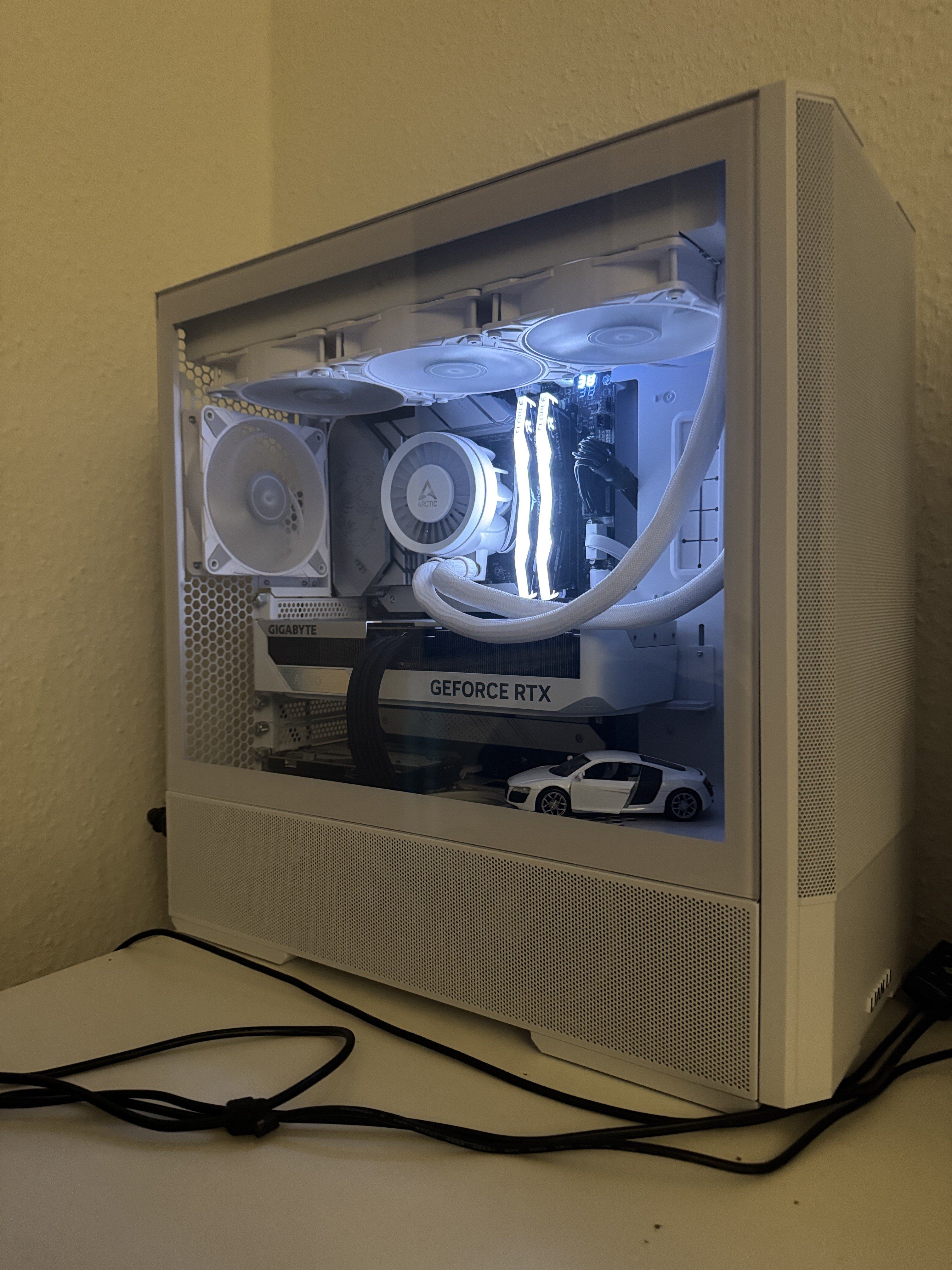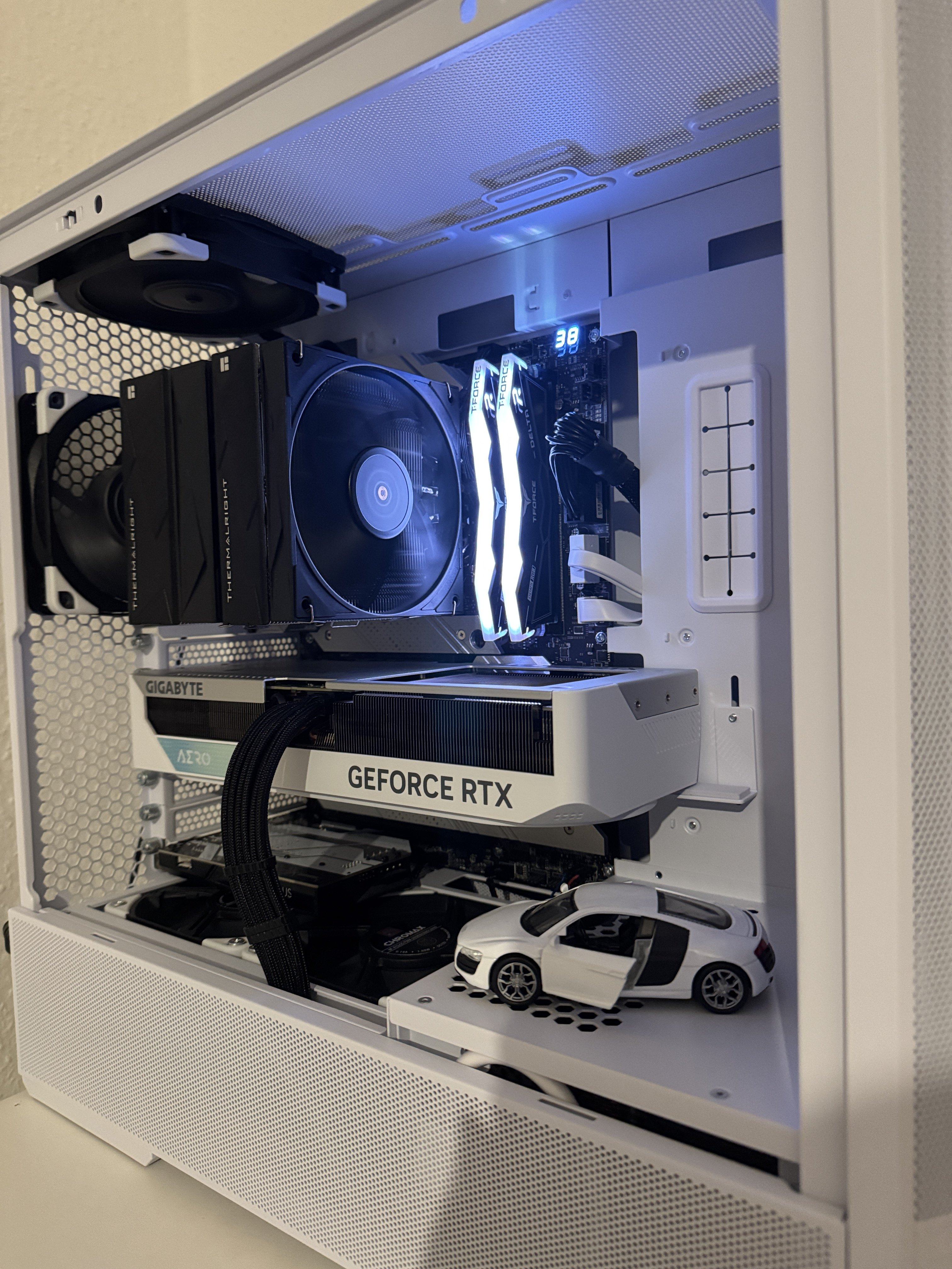 Ich habe nochmals umrüsten müssen, da mir dann doch die Soundkarte fehlte, und mit der vertikal verbauten GPU ging das natürlich nicht. Das System ist super angenehm leise, bis auf den CPU Kühler. Da muss ich noch mit der Lüfterkurve experimentieren, sobald die Halteklammern für den zweiten Lüfter gekommen, und diese montiert ist.