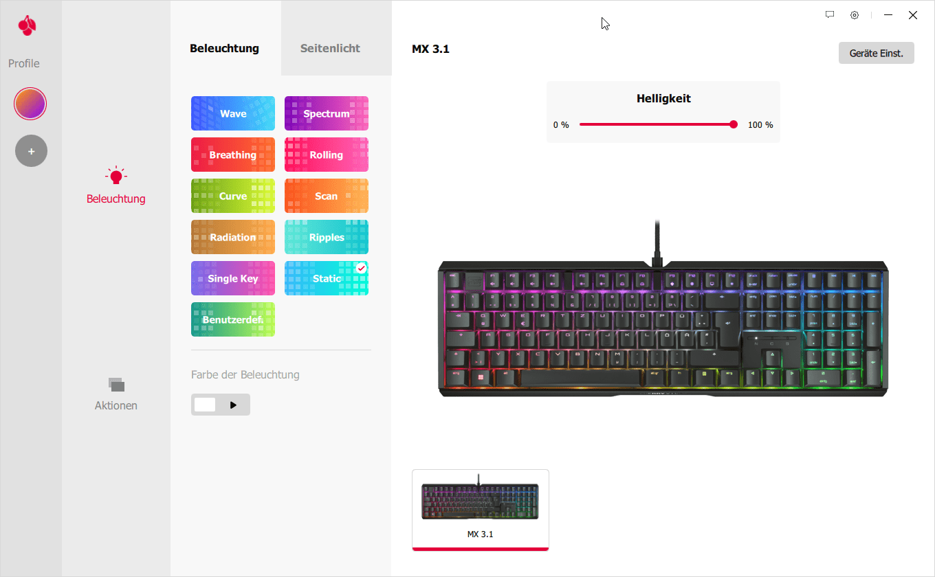 Zudem können alle Tasten individuell beleuchtet oder die Beleuchtung deaktiviert werden. Somit kann man z.B. für Spiele die erforderlichen Tasten hervorheben oder in den Hintergrund bringen.