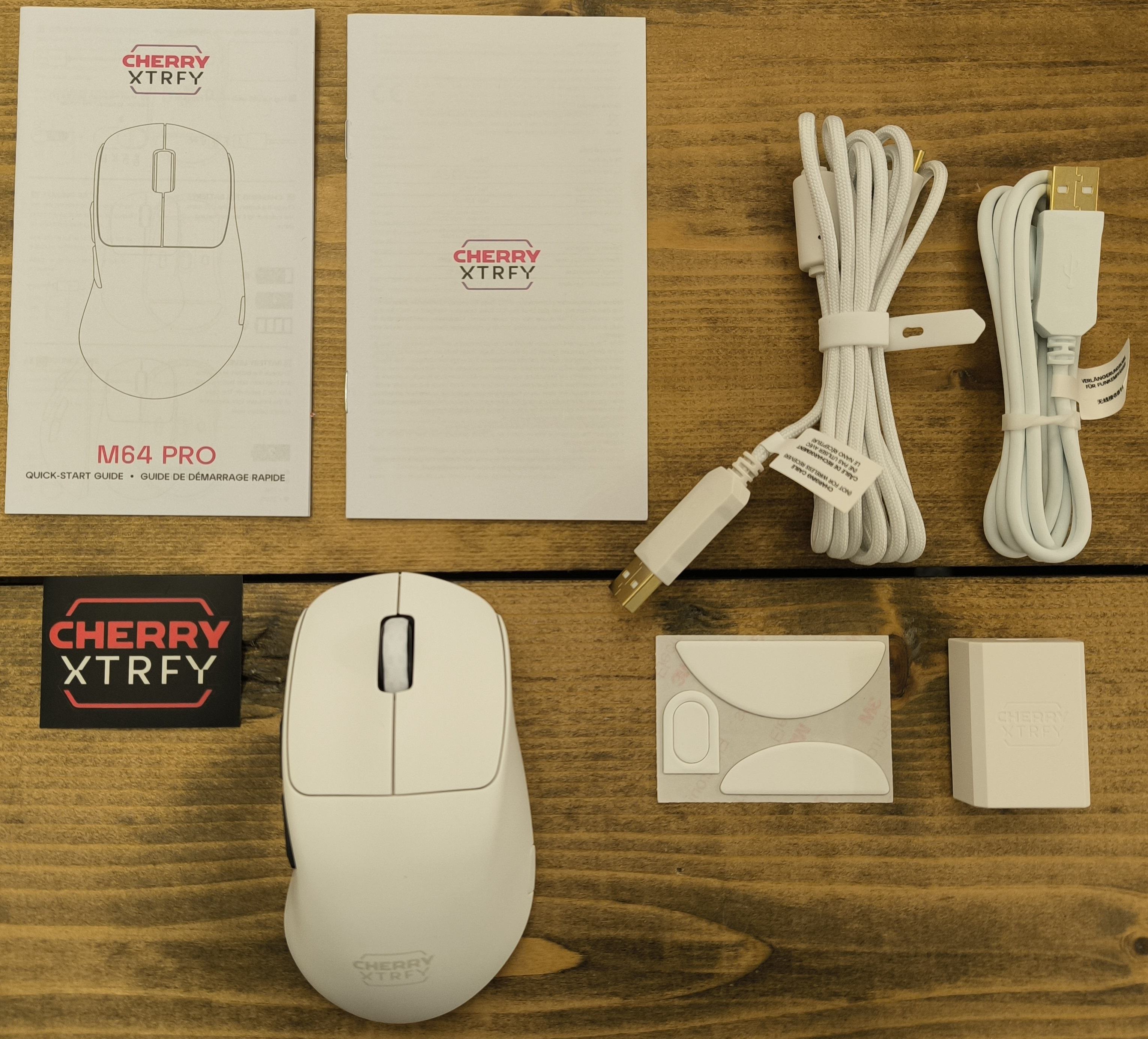 Neben der Maus beinhaltet der Karton noch den Wireless Empfänger, ein gummiertes USB-A auf USB-C Kabel, ein geflochtenes USB-A auf USB-C Kabel, Austausch Gleiter-Pads, zwei kleine Broschüren mit Infos zu den Funktionen der Maus und ein CHERRY XTRFY Aufkleber.