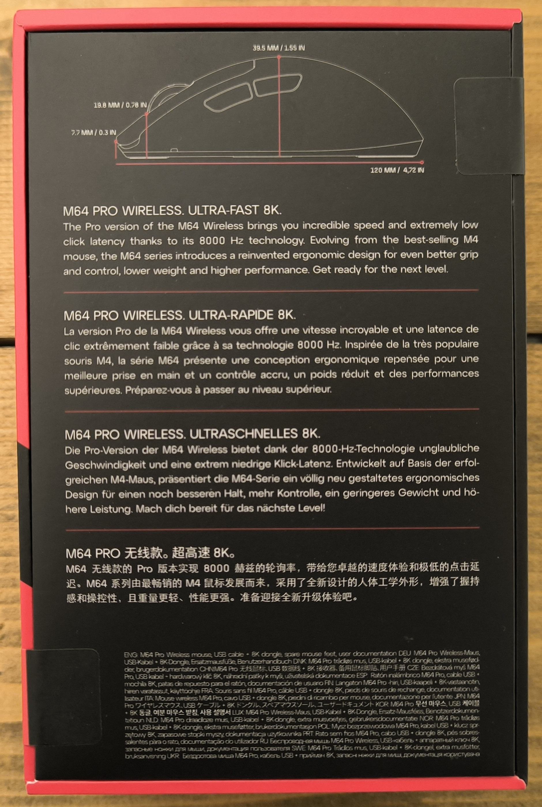 Das Design des Produktkartons der CHERRY XTRFY M64 Pro Wireless ist identisch zur Tastatur. So befindet sich auch hier ein großes Produktbild auf der Vorderseite und einige Informationen zur Maus auf der Rückseite.