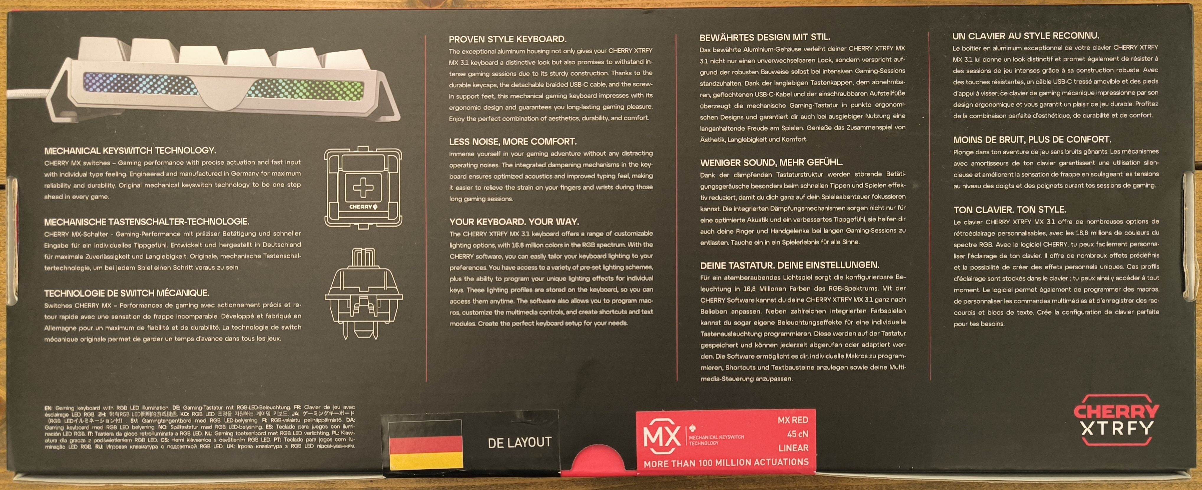 Nachdem ich über 15 Jahre mit der gleichen Tastatur unterwegs war, wusste ich nicht so recht, was mich beim Umstieg auf eine andere Tastatur erwarten würde. Umso erstaunlicher war es für mich, dass ich mich ziemlich schnell an die CHERRY XTRFY MX 3.1 gewöhnt habe. Zum einen ist dies natürlich auf den 1:1 Umstieg des Layouts zurückzuführen. Zum anderen fühle ich mich mit den Tastenanschlägen einfach wohl.
