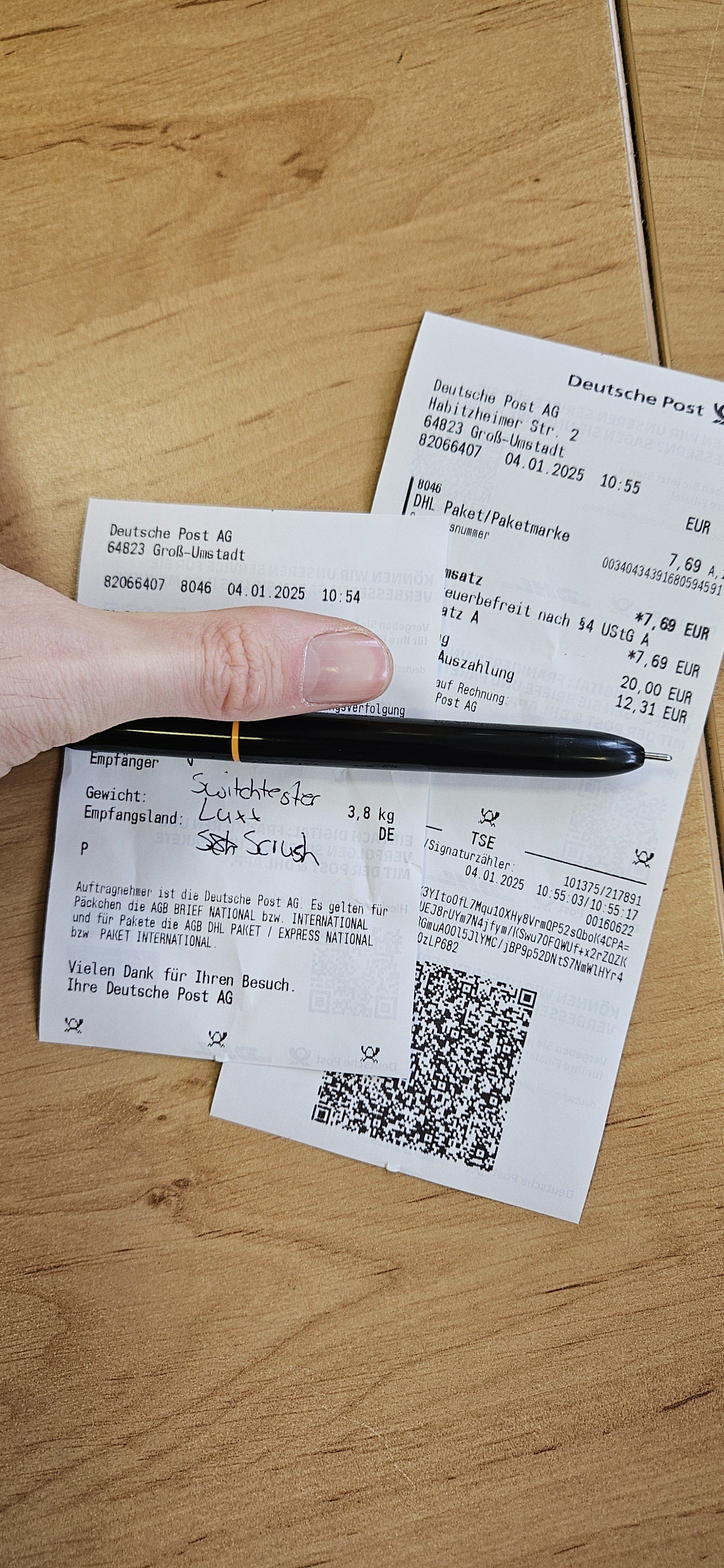 Am 19.11.24 hat @Wolfpack den Tester bei DHL abgegeben, zwei Tage später am 21.11.24 wurde er bei mir zugestellt. Nach 14 Tagen bei mir habe ich den Tester wiederum am 05.12.24 bei DHL eingeliefert, woraufhin er Dir - bedingt durch Wochenende nach vier Tagen - am 09.12.24 geliefert worden ist. Nach 16 Tagen, am 25.12.24, kündigst Du an, das Paket am darauffolgenden Montag (sprich 30.12.24) weiterzuleiten. Das wären dann 21 Tage oder drei Wochen gewesen. Heute, nach 24 Tagen, verschiebst Du dann erneut auf Montag, nun den 06.01.24, womit der Tester dann, bei tatsächlichem Versand an diesem Tag, 28 Tage oder ganze vier Wochen bei Dir herumgelegen hat.