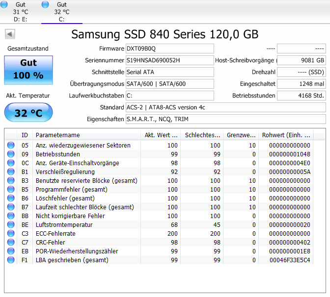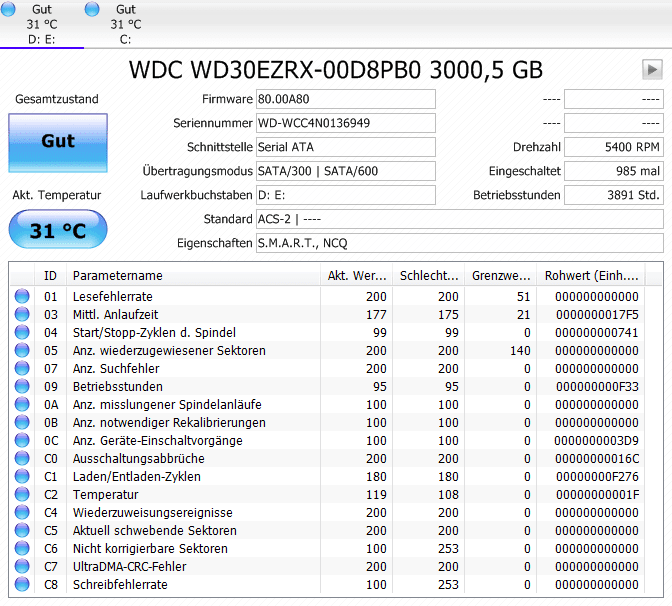 Also das Kabel der Samsung hat ein Problem, teste ob es lose ist und wenn nicht, tausche es aus. Der Rohwert von C7 darf danach nicht mehr steigen, erst dann ist das Problem behoben, fallen wird er aber auch nicht mehr. Sonst sieht alles gut aus, die Green geht halt dauernd in den Unload, vermutlich immer noch 8s ohne Zugriff und dann dauert es bei jedem Zugriff ein paar Sekunden bis sie reagiert.