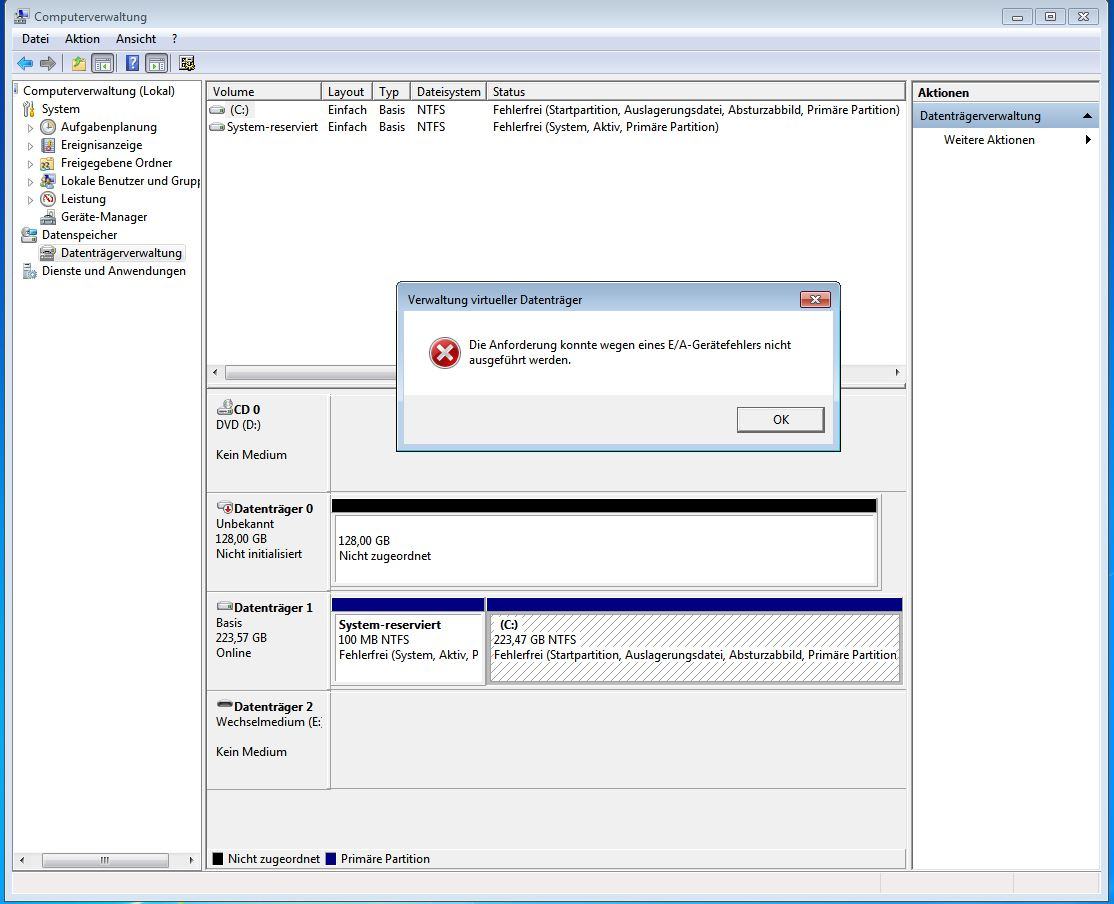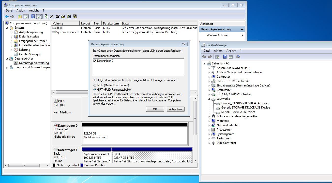 Einziges Problem hab ich bei der HDD Seagate Barracude 2TB. Die wird irgendwie erkannt und dann auch wieder nicht. Erkannt wird im Gerätemanager ein Laufwerk ST000irgendwas. Unter Computerverwaltung im Win 7 auch eine Festplatte mit aber nur 128 GB. Wollte ich initialisieren und dann formatieren aber ich bekomme, egal welcher Partitionsstil, einen E/A-Gerätefehler. Ich vermute schon, dass sie defekt ist.