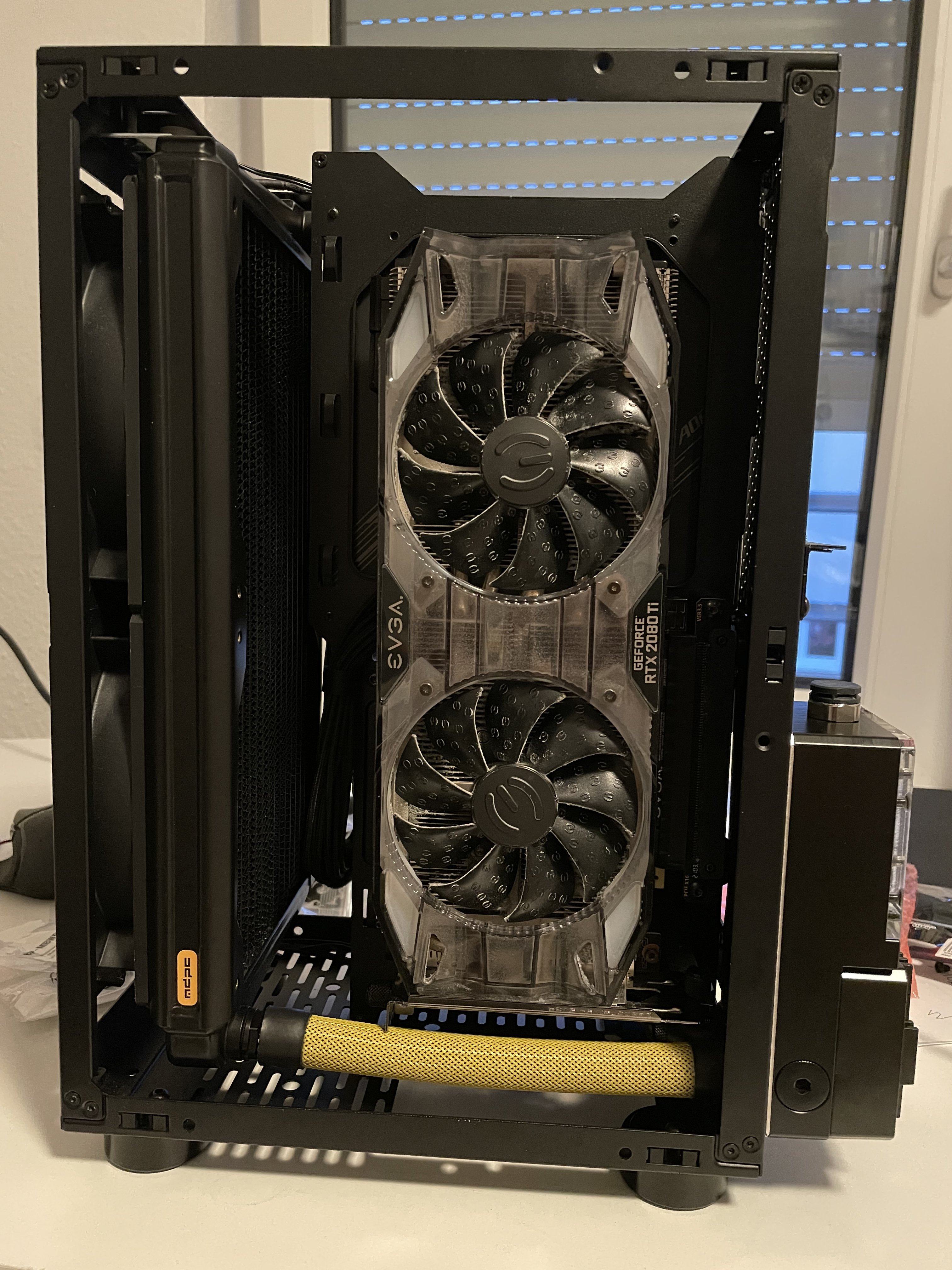 Die RTX 2080 Ti auf Wasser umgebaut und soweit dann alles verschlaucht und nachträglich den Schlauch mit MDPC-X Sleeve gesleeved