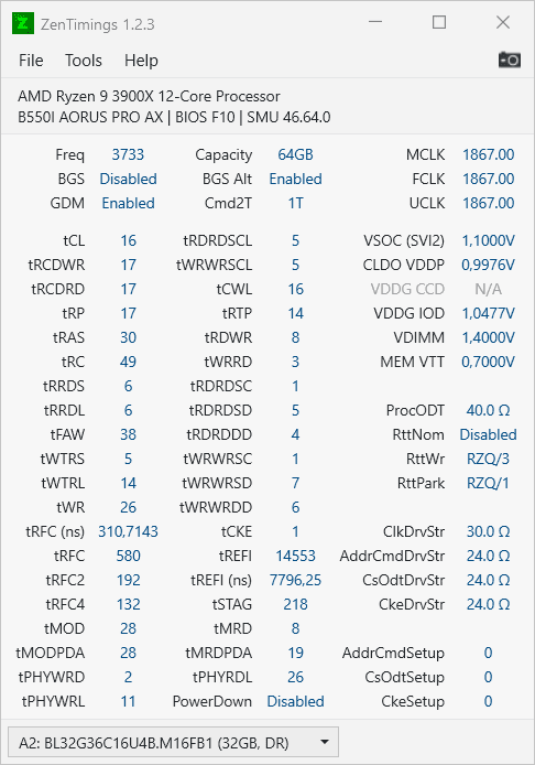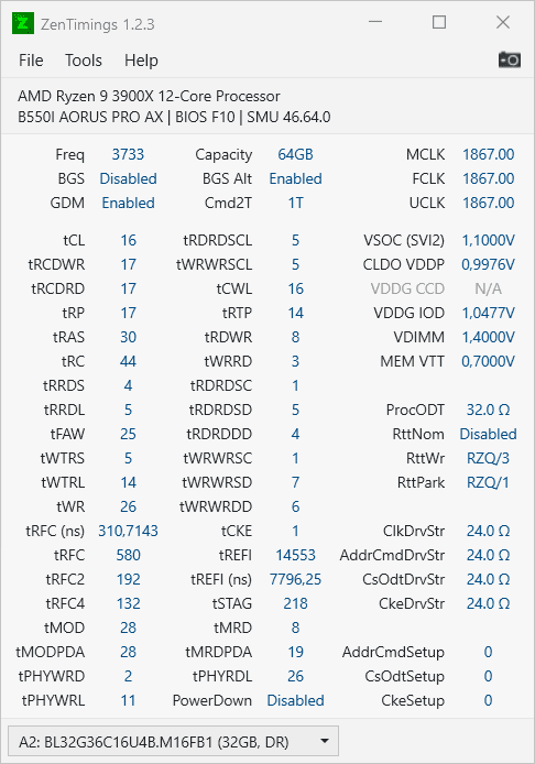 Crucial Ballistix BL2K16G36C16U4R 2x16Gb bei 1,35V. Die Timings bekomme ich nicht weiter runter auch nicht mit 1,4V, dennoch bin ich zufrieden.Vorher: Nachher: