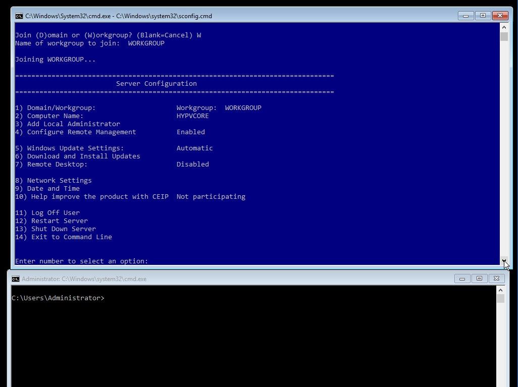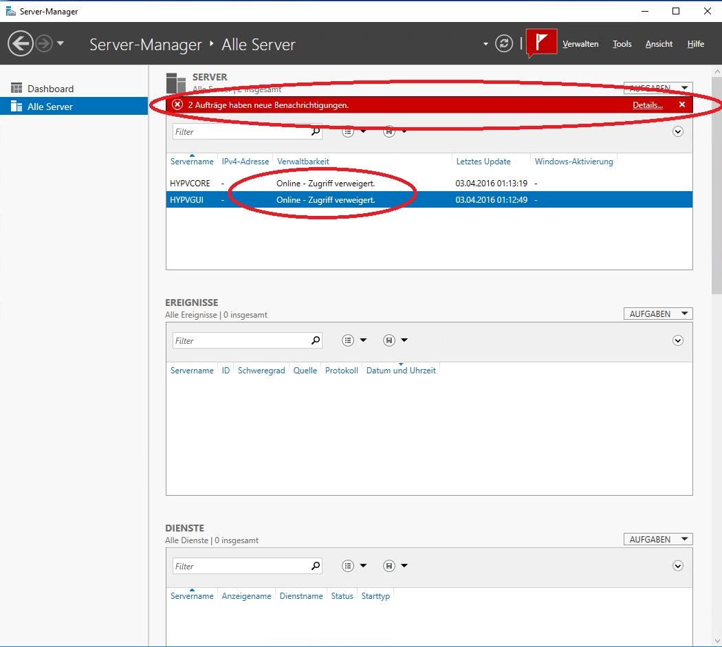 einheitlichen Benutzer-Account mit Administrator-Rechten. Einheitlich heißt: gleicher Name, gleiches Passwort. Falls Ihr nur mit den Hyper-V Servern arbeitet, könnt Ihr natürlich den eingebauten Administrator-Account benutzen und müsst nur das gleiche Passwort setzen (admin-cmd: "net user Administrator *"). Das habe ich hier gemacht.