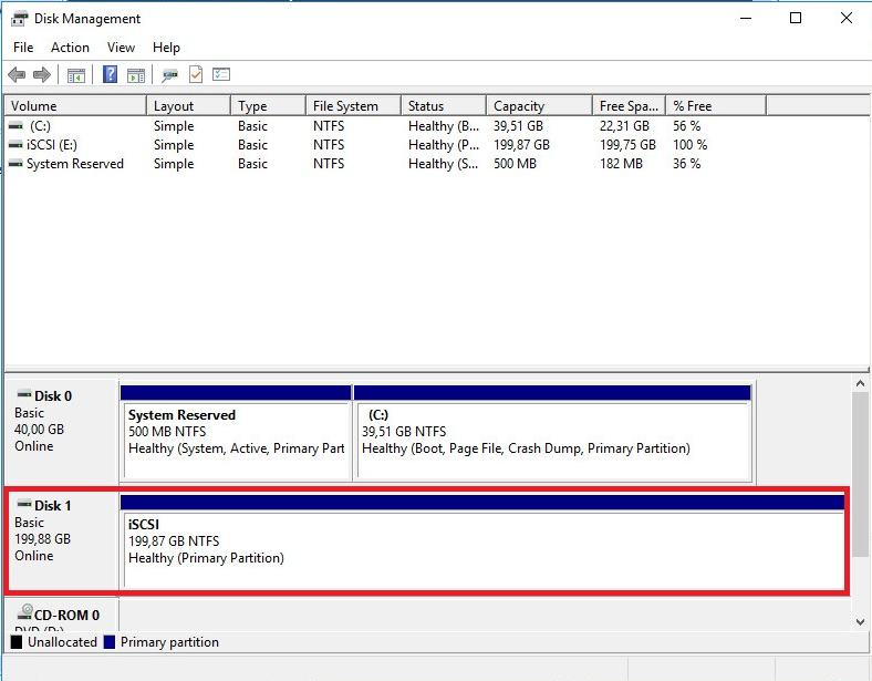 * Volume 3 E iSCSI NTFS Partition 199 GB Healthy