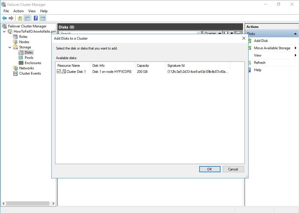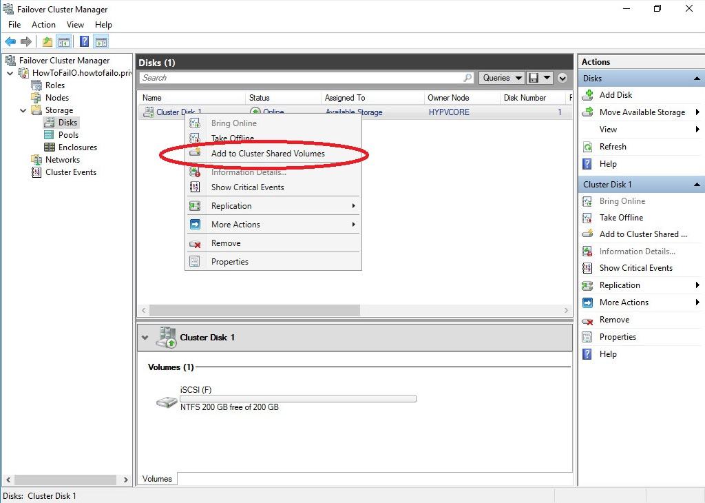 Cluster Shared Volume einrichten, also rechtsclick auf die neue Disk, darin "Add to Cluster Shared Volumes":