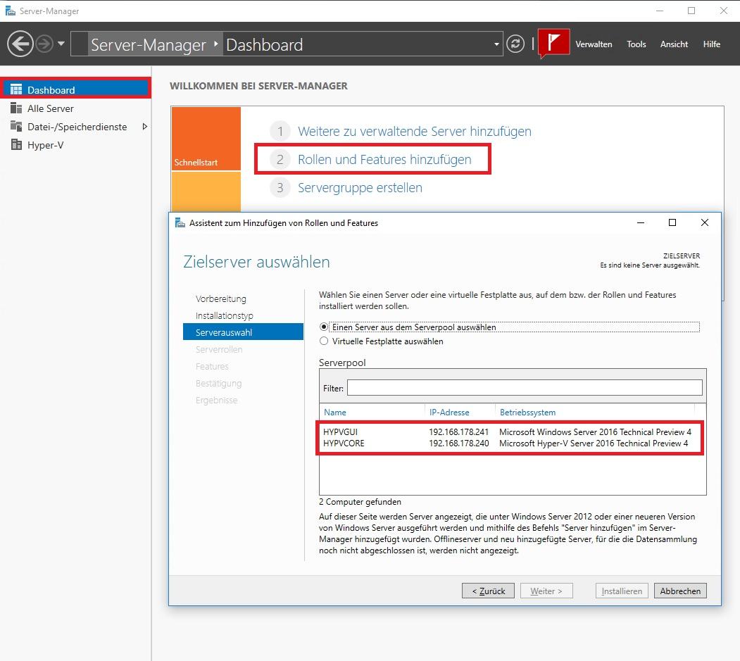 - Über GUI: Wir gehen im Server Manager zum Dashboard und wählen "Rollen und Features hinzufügen". In dem sich öffnenden Wizard clicken wir munter auf weiter, bis wir zur Serverauswahl kommen. Dort wählen wir nun unseren remote zu steuernden Server.