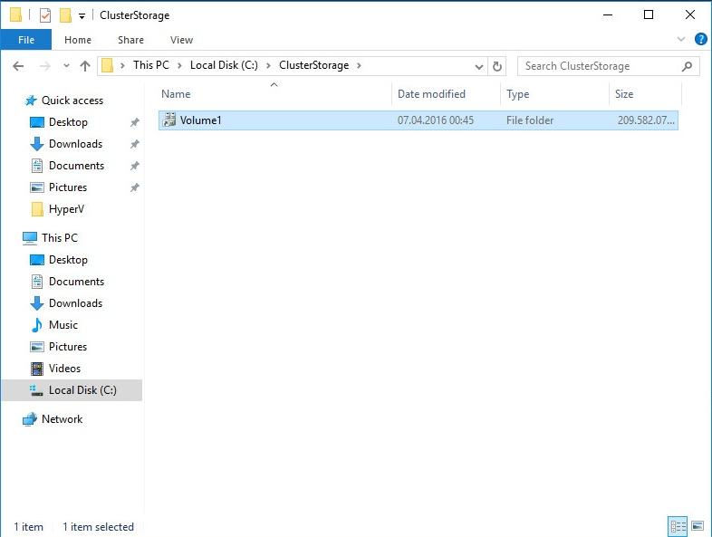 Hinweis: Obwohl wir die "DISK" offline genommen haben, ist diese jetzt übrigens auf beiden Servern lokal verfügbar unter "c:\clusterstorage\volume1\":