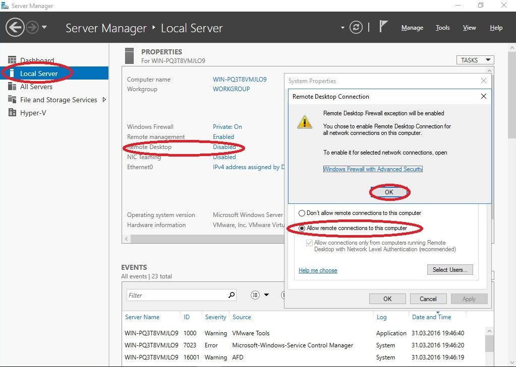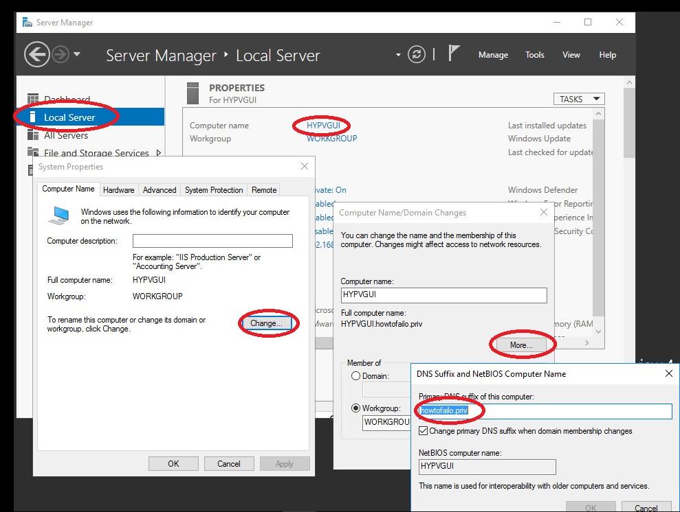 ein solches DNS-Suffix haben. Keine Ahnung ob das immer der gleiche sein muss, hab bei beiden Hyper-V-Hosts vorsichtshalber den gleichen genommen (howtofailo.priv). Ich hab's nicht getestet, ob/wie es auch ohne geht. Also machen wir's halt (auf allen Hyper-V Hosts für's Cluster! Connecten dafür bitte per RDP zu unseren remote-Server