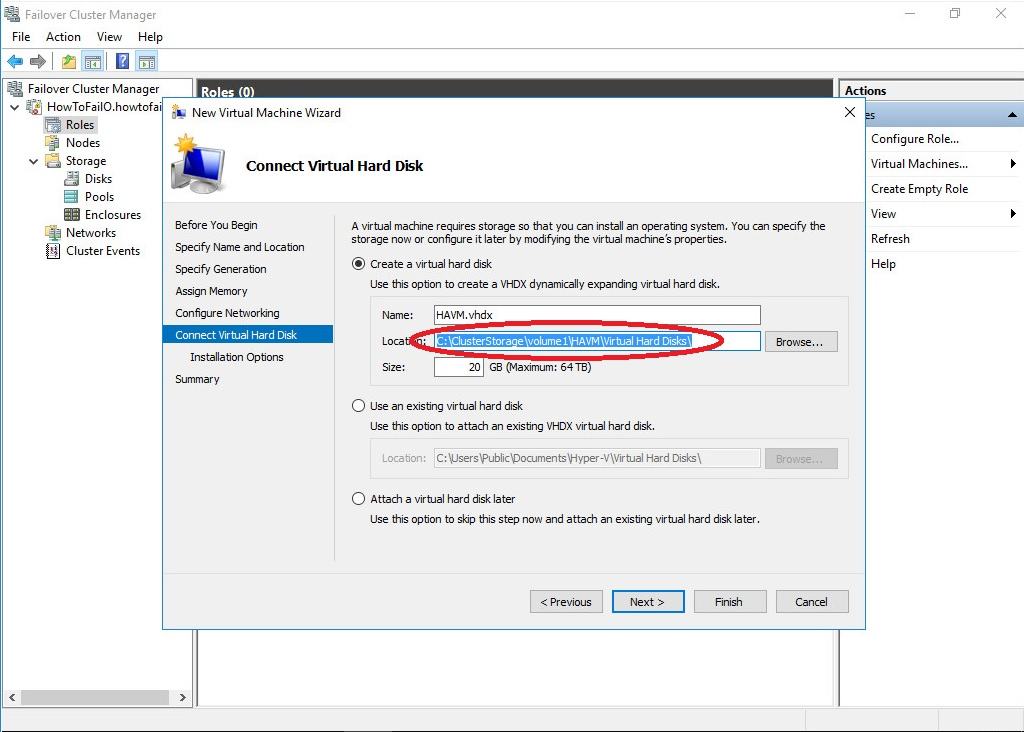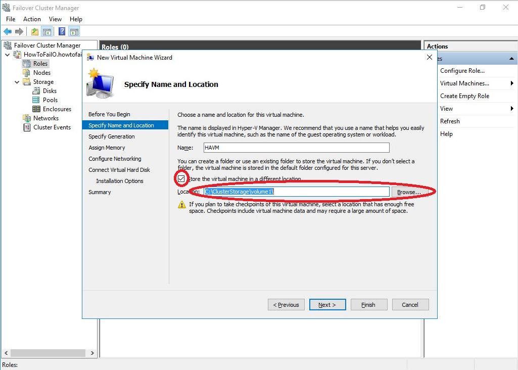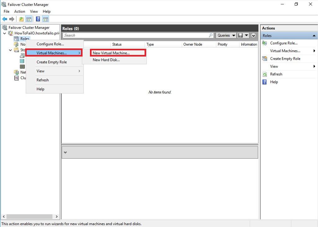 Wir starten das Ganze am besten über den Failover Cluster Manager (nicht im Hyper-V Manager) durch einen rechtsclick auf "Roles", wählen "Virtual Maschine" und "New Virtual Maschine" und wählen einen Server für die Erstellung aus (ist m.W. eigentlich egal welchen).