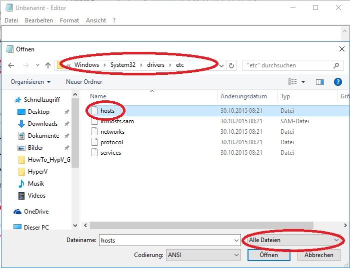 Also Editor (Notepad) als Administrator ausführen, auf Datei-->Öffnen clicken, alle Dateien auswählen und navigieren zu c:\Windows\System32\drivers\etc-->Datei "hosts" öffnen: