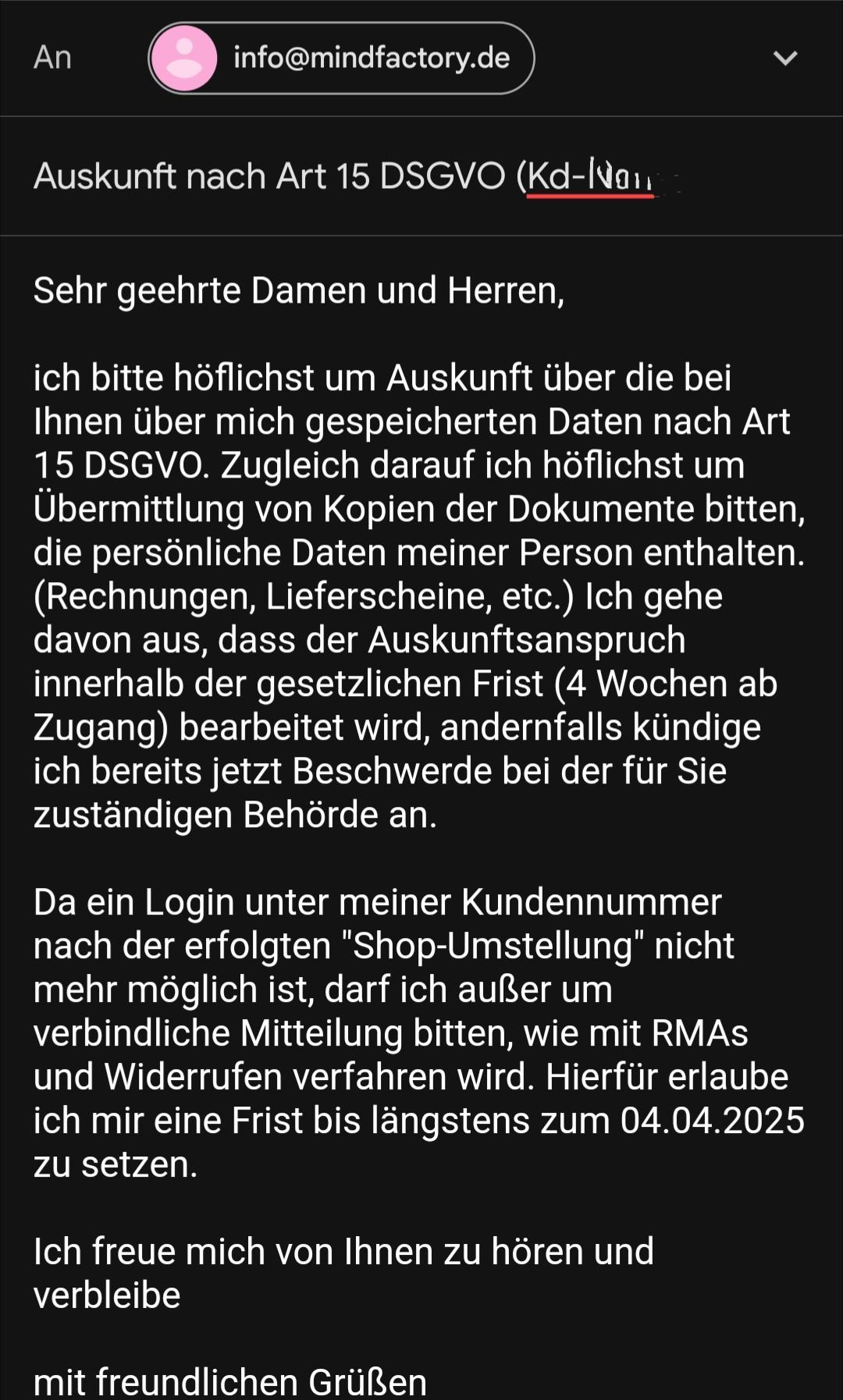 Ich glaub ich mach mal dort ne Anfrage nach den dort gespeicherten Daten nach Art 15 DSGVO und lass mir Kopien der gesamten Korrespondenz geben. Mal schauen was passiert (wohl nix) aber vielleicht kommt dann ja irgend eine Information.