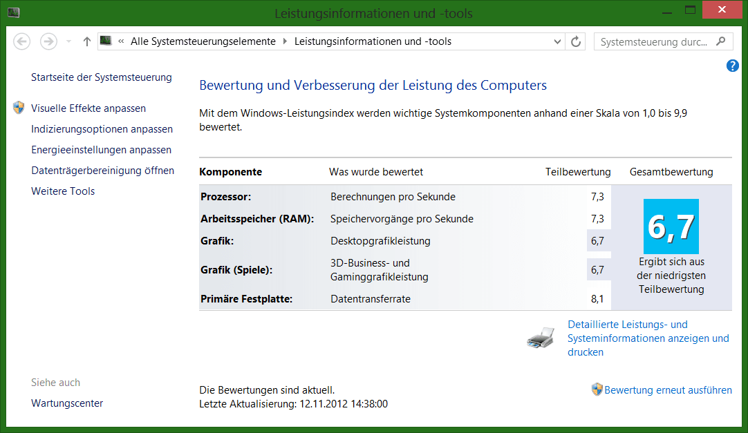 So mal ein kleines Update mit ein paar Bildern des Systems, sowie einem Screenshot vom Windows 8 Leistungsindex!