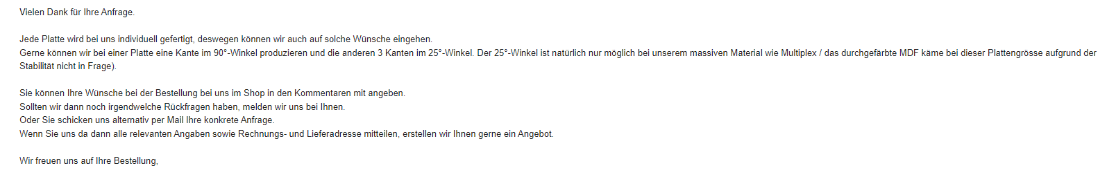 Ich würd mich eher nach einer alternativen Platte umschauen, die ist schon sehr, sehr teuer und dann noch ein Kompromiss. Da ist selbst ein bearbeiterer Echtholzzuschnitt günstiger.. hier mal ein Beispiel, sogar mit Antiverzugsschienen und Facettenkante. Vorsicht, Versand und MwSt. kommt da noch drauf, da war ich gerade zu faul für.