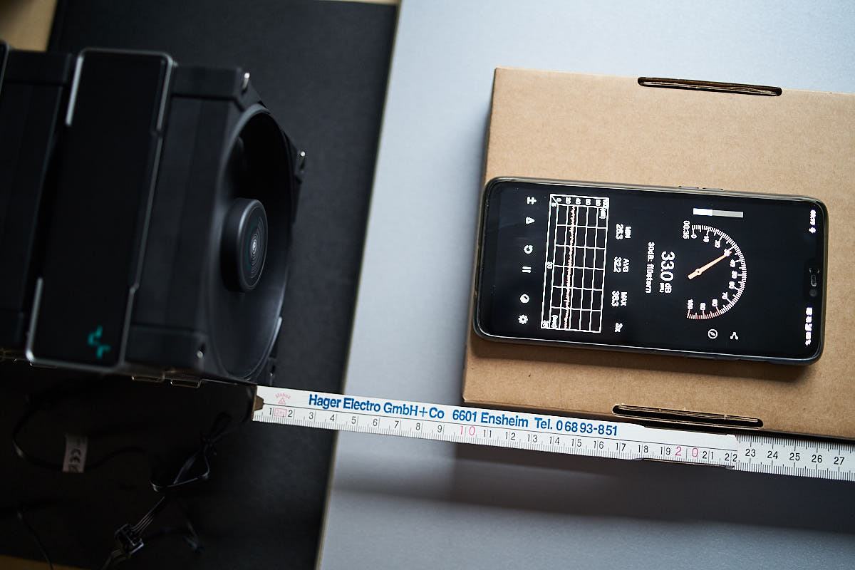 Um die Lüfterdrehzahl bzw. das benötigte PWM-Signal zu bestimmen, bei dem alle Kühler möglichst nah an einem vorgegeben dBA-Wert liegen, wurde die Lautstärke mit einem Smartphone in einem Abstand von 10cm zur "Lärmquelle" gemessen, um auch bei niedrigen Drehzahlen einen Schalldruckpegel messen zu können der ausreichend vom Umgebungsschaldruckpegel abweicht. Hierzu wurde der Schalldruckpegel über 30 Sekunden aufgenommen und der Mittelwert der Messung als Wert für den Schalldruckpegel genutzt. Als Referenz für die zwei auf Schalldruck normalisierten Temperaturmessungen dient der Noctua NH-D15s mit eLoop Lüfter bei etwa 700 bzw. 1200rpm. Zusätzlich wird noch eine dritte Messung bei maximaler Drehzahl des Kühlers durchgeführt. Auch hier wurde der zugehörige Schalldruckpegel bestimmt.