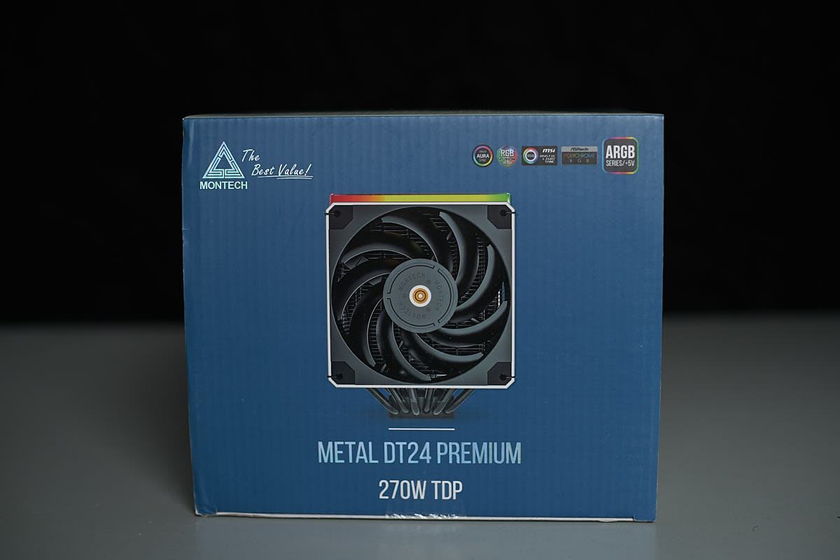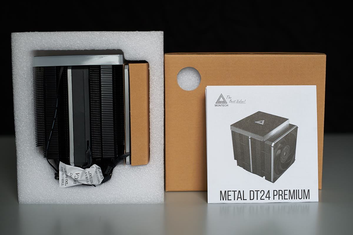 Der Montech Metal DT24 Premium kommt in einem recht simplen Karton, auf dem einige Bilder des Kühlers sowie die Spezifikationen zu finden sind. Innerhalb der Box findet man eine Montageanleitung, eine weitere Schachtel für das Zubehör und den Kühler, der sicher in einem ausreichend dimensionierten Schaumstoffpolster liegt und somit für den Transport gut geschützt sein sollte.