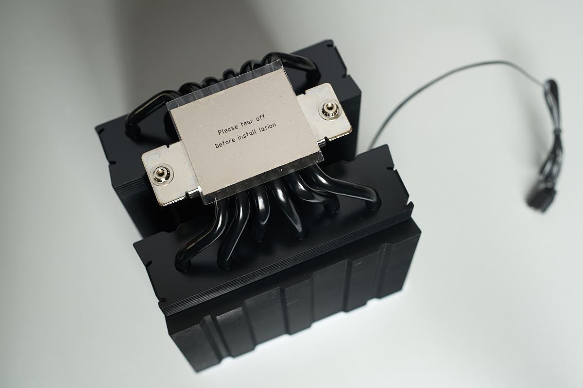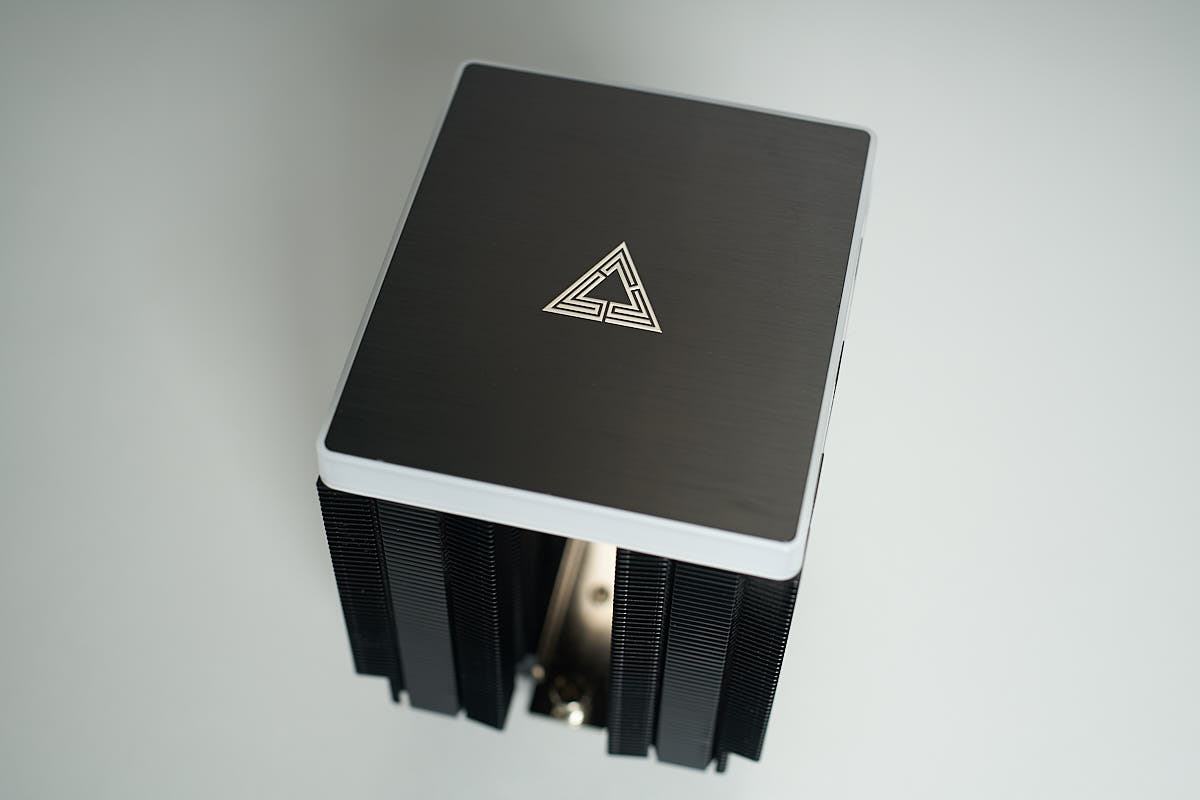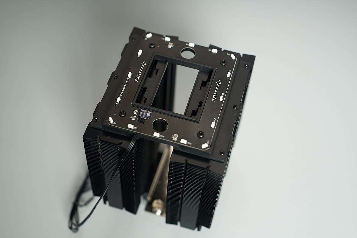 Der Kühler selbst ist ein "klassischer" Dual Tower Kühler, dessen Lamellen, Heatpipes und die Bodenplatte (abgesehen von der Kontaktfläche zur CPU) schwarz lackiert wurden. Auffälligstes Merkmal des Kühlers wird die aus milchigem Kunststoff bestehende Abdeckung der Beleuchtung sein auf die eine schwarz eloxierte und gebürstete Aluplatte mit dem Montech Logo aufgeklebt ist. Nimmt man die Abdeckung ab, so findet man darunter eine Platine mit insgesamt 16 RGB LEDs, die über eine Halterung mit den beiden Kühltürmen verschraubt ist. Dort finden sich auch zwei Löcher in der Platine um mit einem langen Schraubenzieher (leider nicht im Lieferumfang) an die Schrauben am Bügel über der Bodenplatte zu gelangen um den Kühler mit am Retentionmodul verschrauben zu können. Die Verarbeitung des Kühlers würde ich als gut bezeichnen, Scharfe Kanten habe ich keine finden können und sämtliche Teile des Kühlers sind sauber lackiert. Einzig die Schutzfolie auf der Bodenplatte hat bei meinem Exemplar beim Abziehen leichte Rückstände hinterlassen, die ich vor der Montage des Kühlers noch mit Isopropanol gereinigt habe.