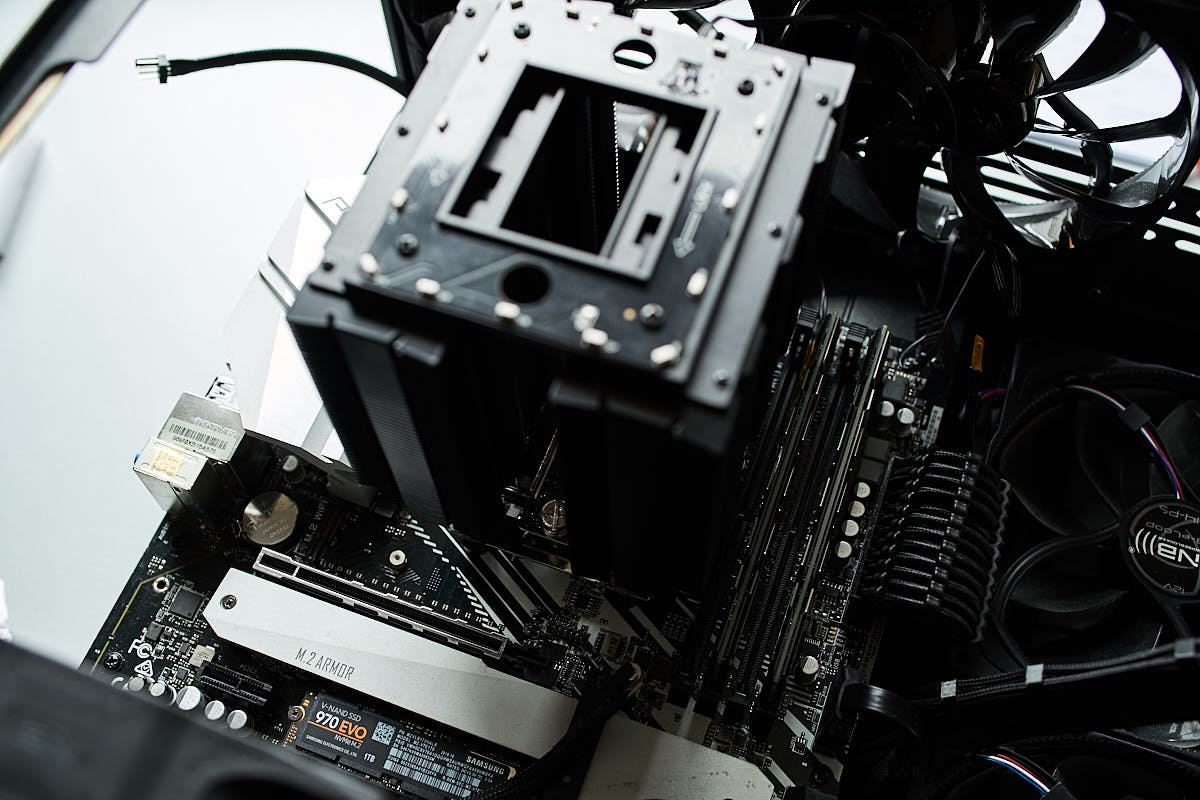 Auf AM4 ist es grundsätzlich möglich den Kühler (ausgehend von den Standard AMD Brackets) zu montieren, ohne dabei das Mainboard aus dem Gehäuse nehmen zu müssen. Dafür entfernt man erst eine der Halteklammern und ersetzt sie durch die mitgelieferten Daumenschrauben, bevor man die zweite Halteklammer löst. Anschließend wird noch die Platte aufgelegt, an der später der Bügel in der Bodenplatte des Kühlers verschraubt wird, und mit vier Muttern gesichert. An der Stelle möchte ich erwähnen, dass die Montageplatte bei mir leicht verzogen war, hat sich nach anziehen der Muttern aber in die gewünschte Form ziehen lassen. Als nächstes wird der Kühler mit der Platte des Retentionmoduls verschraubt. Die Montage des Kühlkörpers selbst ist in der Anleitung ausreichend beschrieben und ist auch in der Praxis ohne große Fummelei durchführbar (solange ein langer Schraubenzieher vorhanden ist).