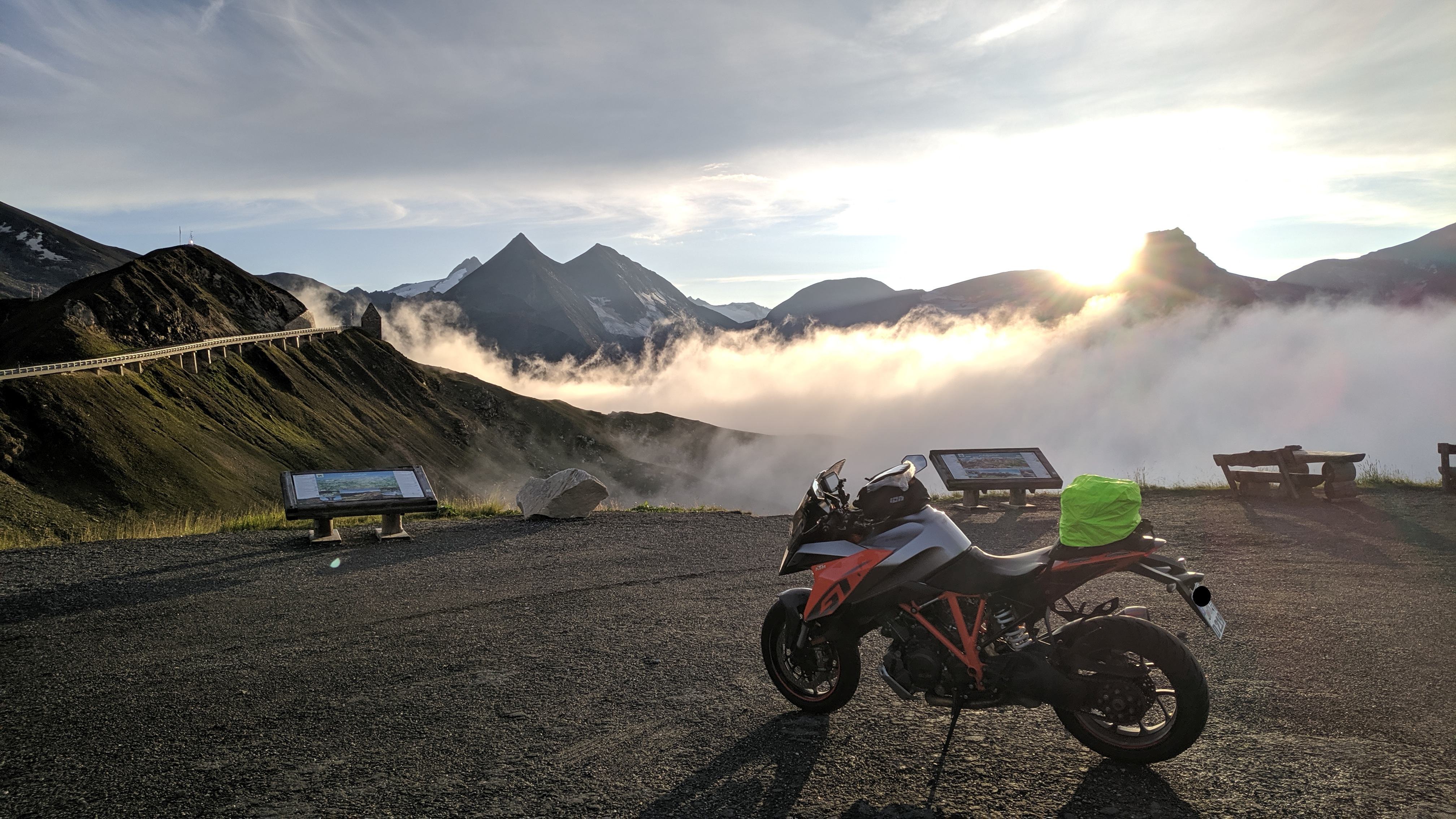 Glück gehabt! Nach 100m freie Sicht und freie Fahrt, Straße trocken.. Null Verkehr. Wahnsinn. In 2h auf der Hochalpenstraße begegneten wir in Summe 2 Autos und 2 Motorrädern!