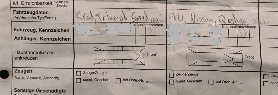 Die Polizei hat den Unfall auch nicht korrekt aufgenommen. Dort wurde vermerkt das ich den Nissan am Heck/Kofferaum getroffen hatte. Passt ja nicht zu dem Hergang und den Bildern die ich gemacht habe. Das muss Montag bei der Behörde korrigieren bzw. richtig stellen lassen.