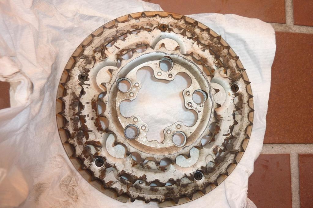 - die jeweils vier am meisten abgenutzten Zähne auf dem 34er und 42er Kettenblatt (je zwei gegenüber) sind wohl Steighilfen und gehören mehr oder weniger so (auf Bildern von dem Modell in neu sind sie abgeflacht)