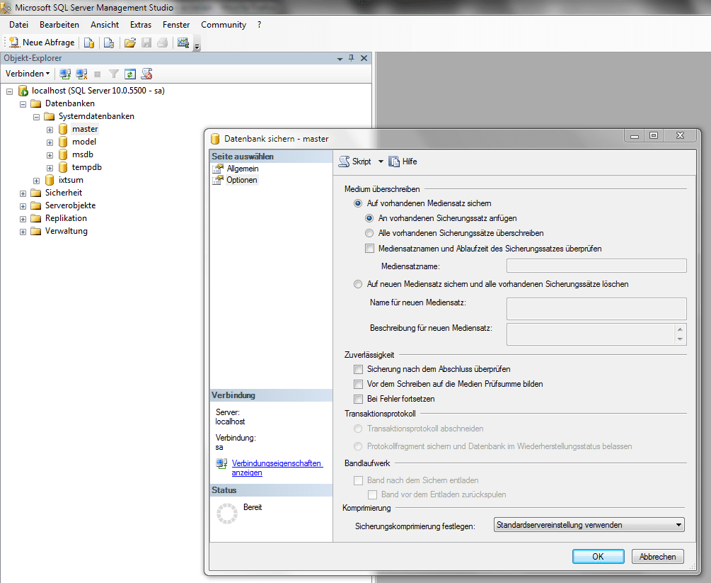 Im Anhang habe ich einen SS von der Sicherungsoption gemacht. Dort kann man das Transaktionsprotokoll (theoretisch) aktivieren, doch leider ist die Otpion ausgegraut.