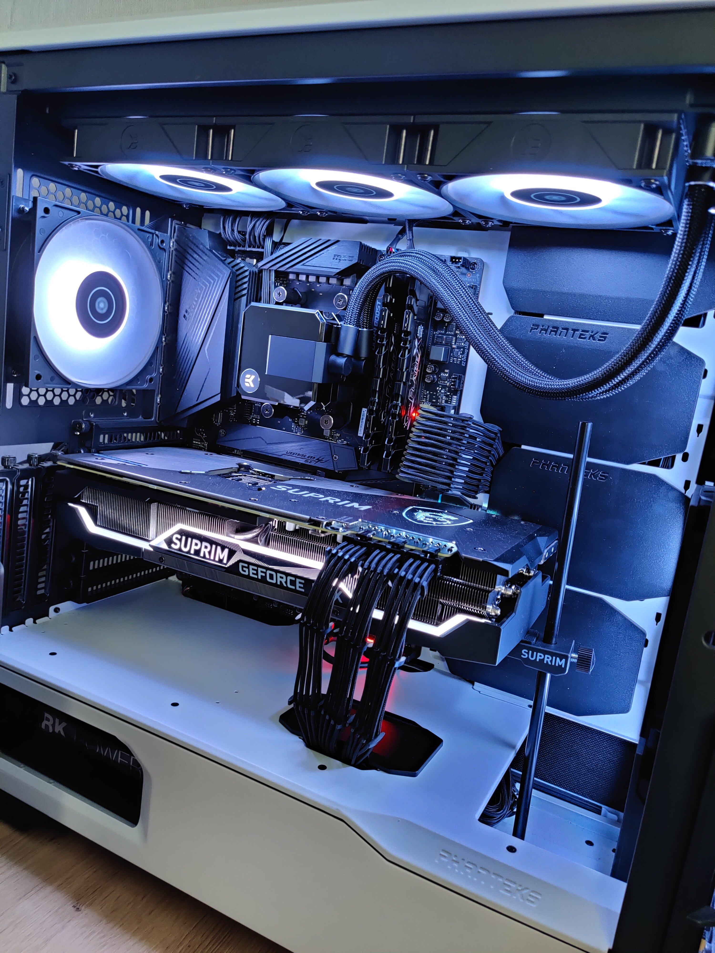 Ich vermute mal, dass man die Backplate und generell die Kühlung der Suprim X im idle bei ausgeschalteten Lüftern am besten vertikal hinbekommen ( vorausgesetzt man hat unten Lüfter für Frischluft ).