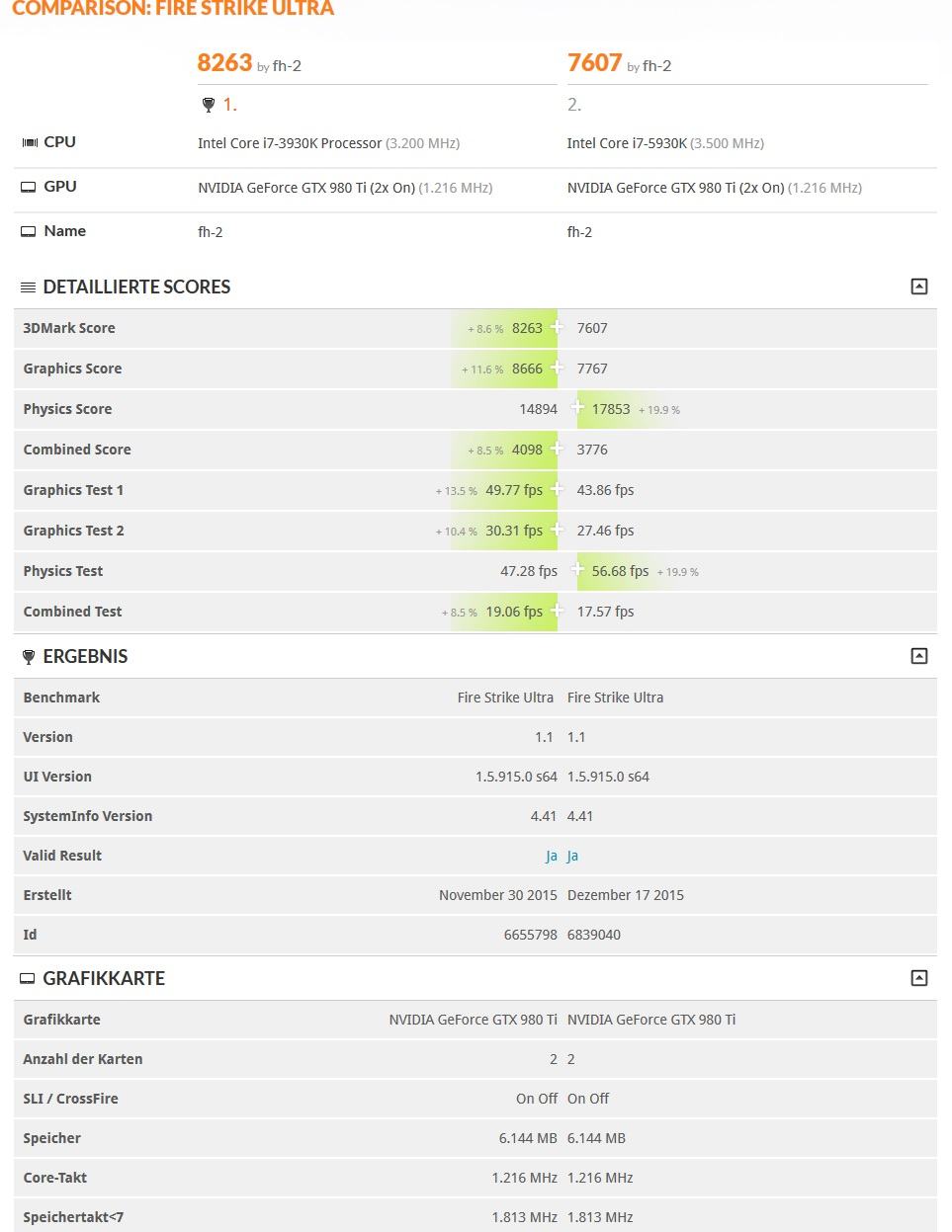 Beide stecken in den x16 Gen3 PCIE Ports wie es sein soll die CPU Leistung ist auch höher als bei meinem alten i7-3930k@4,2Ghz mit DDR3@2133Mhz wie man auf meinem angehängten Screenshot sehen kann aber von der