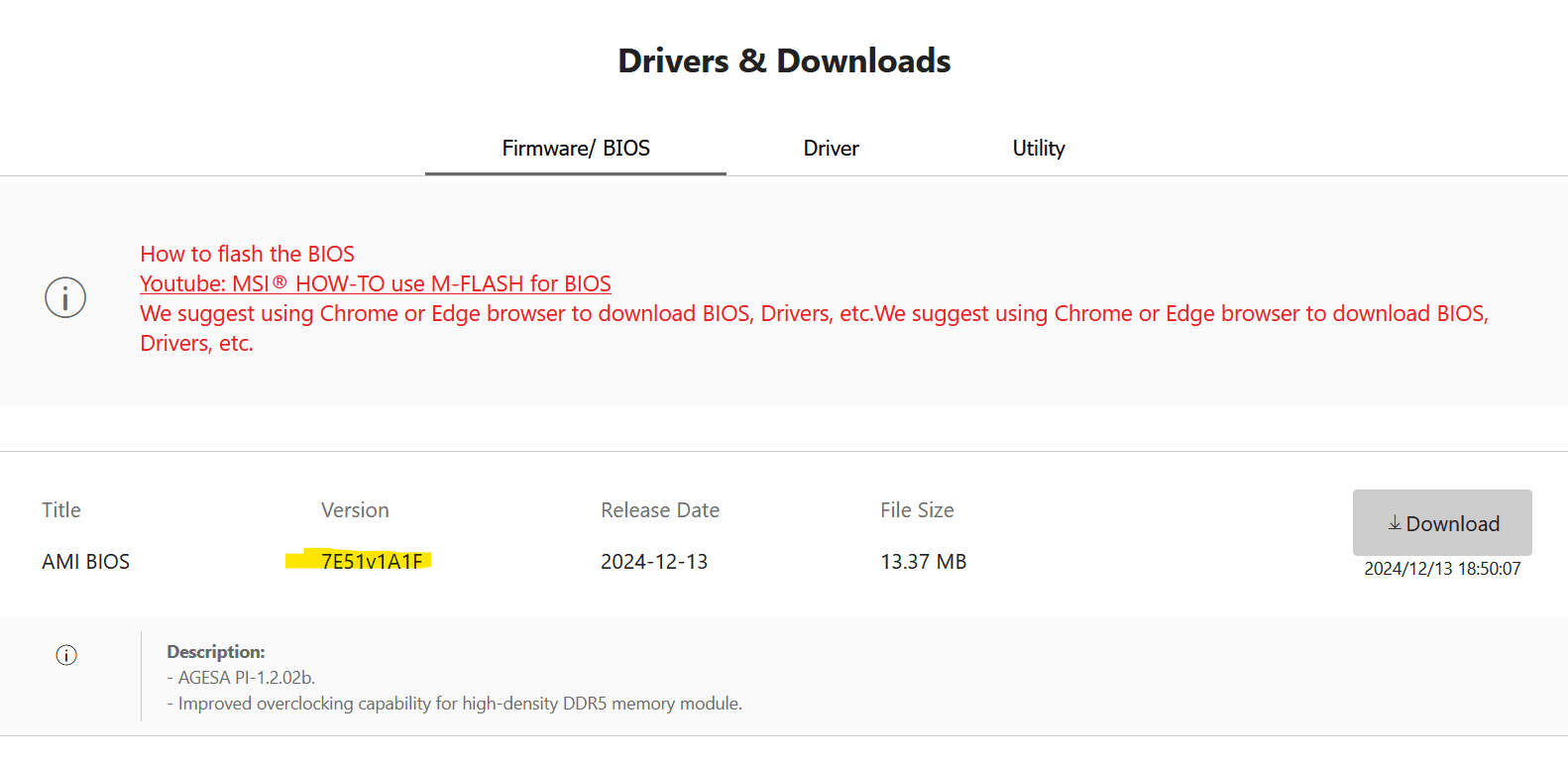 Tolle Neuigkeiten zum A1G, welches im MSI Forum verteilt wird. Der Bezug/die Verteilung von Firmware nimmt immer abstrusere Züge an. Die A1G passt zu dem bisherigen Namensschema. Falls die mir angebotene E7E49AMSI_1A21 doch für das X870 legitim sein sollte, dann zeigt das auch hier wieder, dass die unterschiedlichen Vertretungen nicht auf einem Stand sind. Nach Rückmeldungen gibt es teilweise die gleichen Probleme. Mal schauen wie sich das entwickelt, evtl. kann man sich die Installation des A1G sparen. Beta, Stable, alles gleich bei MSI. 😂