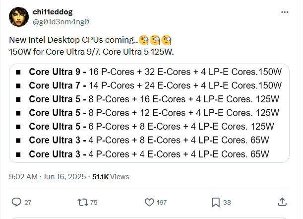 Oder man geht mit Nova Lake eben doch noch auf den S.1851, dann bleibt der S.1954 eben für die nächste Generation, wenn absehbar wäre, dass DDR6 dann verfügbar sein wird und man nimmt eben in Kauf, dass die Fortschritte bzgl. mehr PCIe 5.0 Lanes und nativem TB5 (Panther Lake hat dies ja schon), statt TB4 dann mit Nova Lake noch nicht kommen. Das würde den schlimmsten Fall vermeiden, aber wäre auch blöd, wenn DDR6 sich länger als ein Jahr verzögert und Razer Lake, Titan Lake (oder wie immer der Nachfolger von Nova Lake dann heißen wird) immer noch nicht mit DDR6 kommen kann?