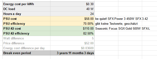 Wolfgangs PSU Liste recherchiert und bin am Ende bei dem Seasonic Focus SGX Gold gelandet, welches ein "gute" Effizienz bei 40 W hat (82.5%) und bei geringer Leistung auch passiv kühlt. Alternativ wäre aus meiner Sicht das