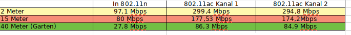 | Name | OS | Netzwerkkarte | 5GHz Speed / MB/sec | 2,4 Ghz Speed / MB/sec |