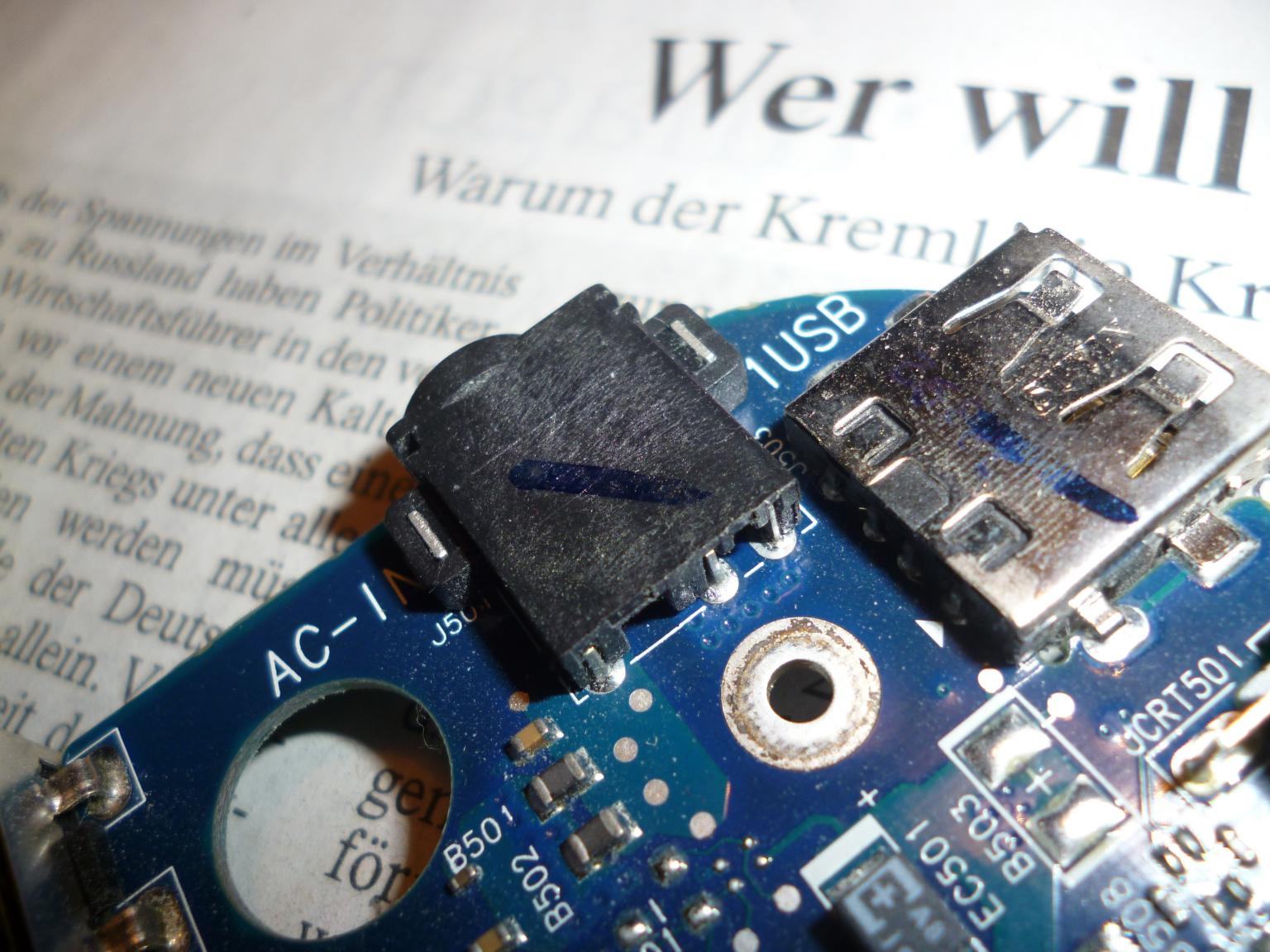 DIe Netzteilbuchse hat erst n Wackler gehabt und jetzt funktioniert sie gar nicht mehr, was ziemlich doof ist. Hab also den Laptop zerlegt und bin nun soweit, dass ich die buchse sehe. Hat jemand schon daran rumgelötet? Eigentlich müssten es die 5 Kontaktstellen sein, an der man das Lot entfernen muss und dann kann man die Buchse rausziehen und wieder einbauen, oder? Hab mal ein Bild angehangen, dass ihr das auch beurteilen könnt. Hat das von euch schon jemand machen müssen oder ähnliches mal gemacht? Buchse ist bestellt, müsste morgen ankommen.
