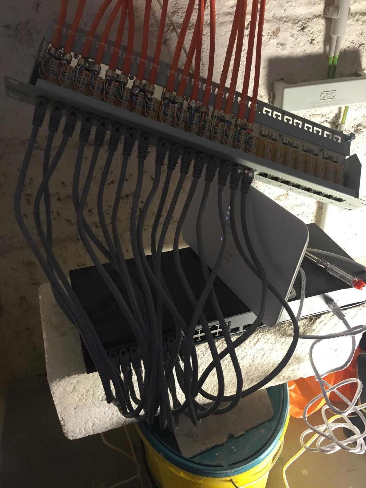 Kauf Dir bitte noch einen kleinen Netzwerkschrank und bau das Patchpanel und den Switch da ein :)